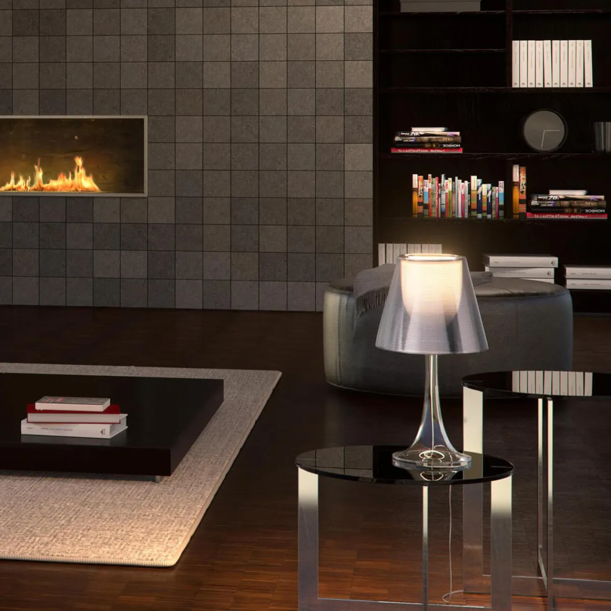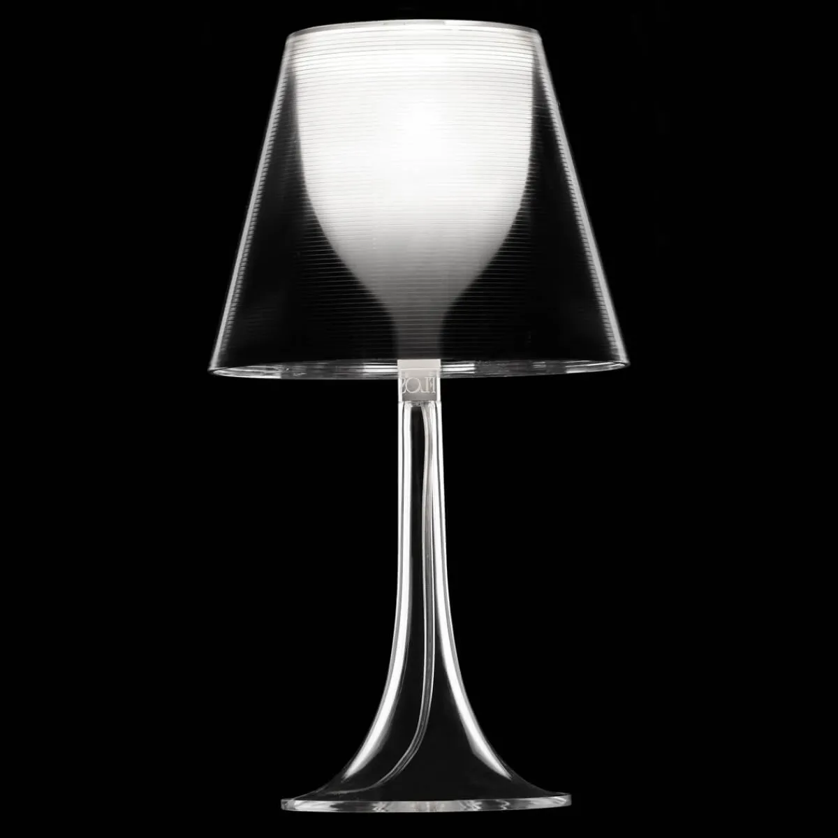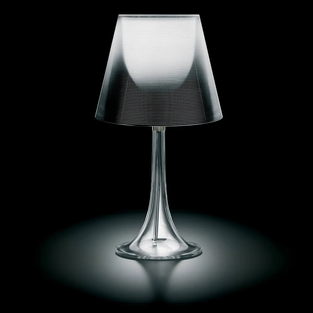 So besteht der elegant geschwungene Leuchtenfuß aus transparentem, spritzgegossenem Polymethylmethacrylat (PMMA). Zwei Diffusoren bilden den Schirm der Miss K Tischlampe: Der innere besteht aus opalem Polycarbonat und gewährleistet ein diffus gestreutes, blendfreies Licht.