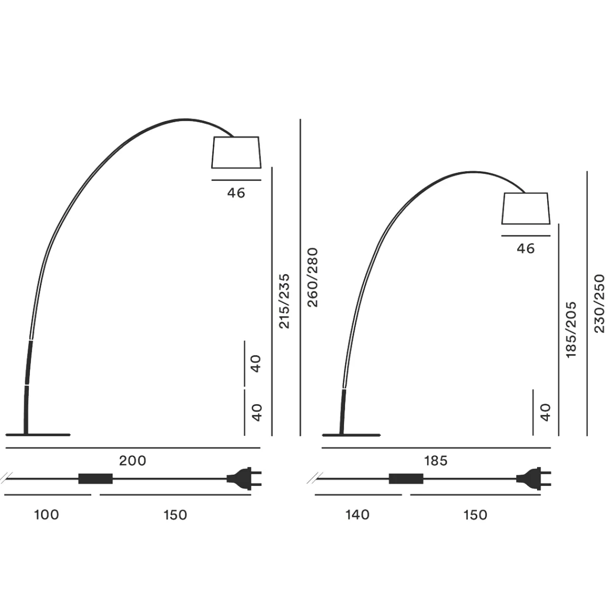 - Die Verlängerungsarme können zwischen Leuchtenfuß und Bogen eingefügt werden und lassen die Stehleuchten auf knapp 3 Meter Höhe anwachsen