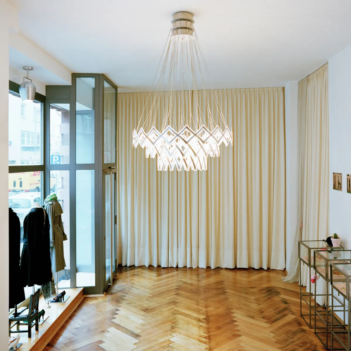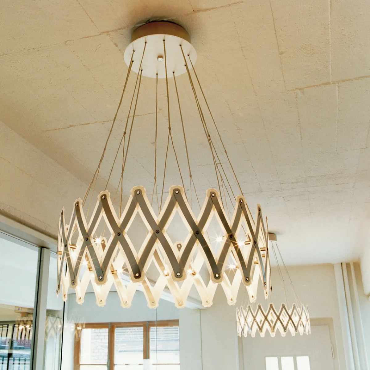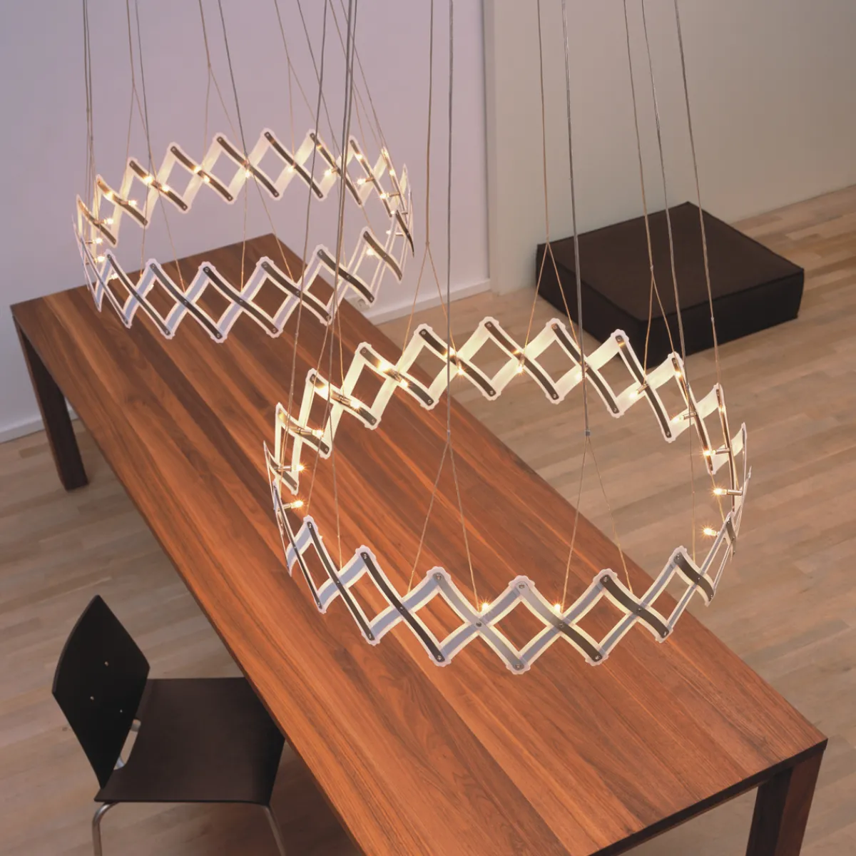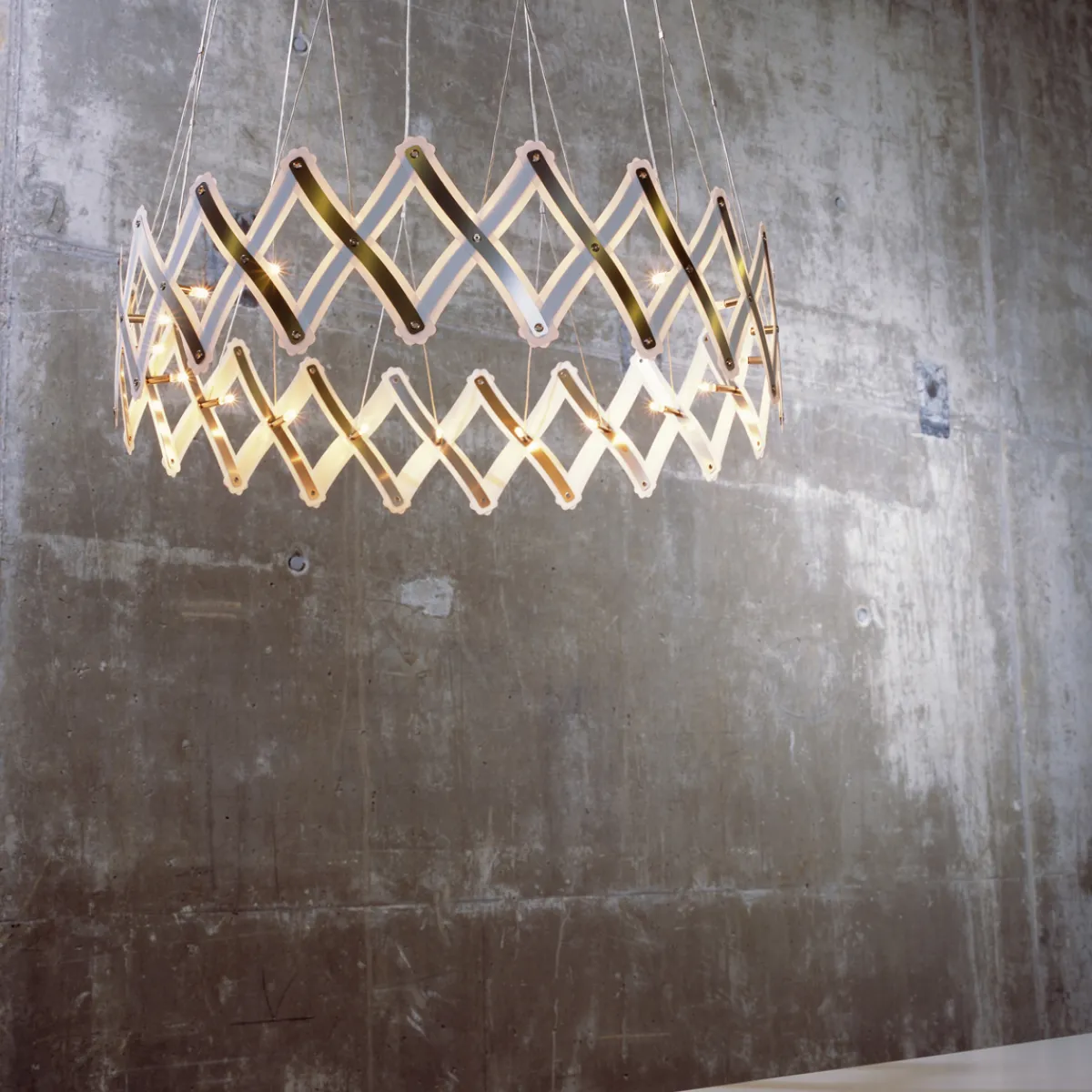 Die serien.lighting Zoom Pendelleuchte lässt sich ästhetisch sowie lichttechnisch den unterschiedlichen räumlichen Gegebenheiten anpassen. Sie ist eine zum Kreis geschlossene Scherengitterkonstruktion, die in ihrem Durchmesser stufenlos verstellt und zu beachtlichen Größen aufgezogen werden kann: von anfänglich 20 cm bis zu einem Durchmesser von 1,30 m.
