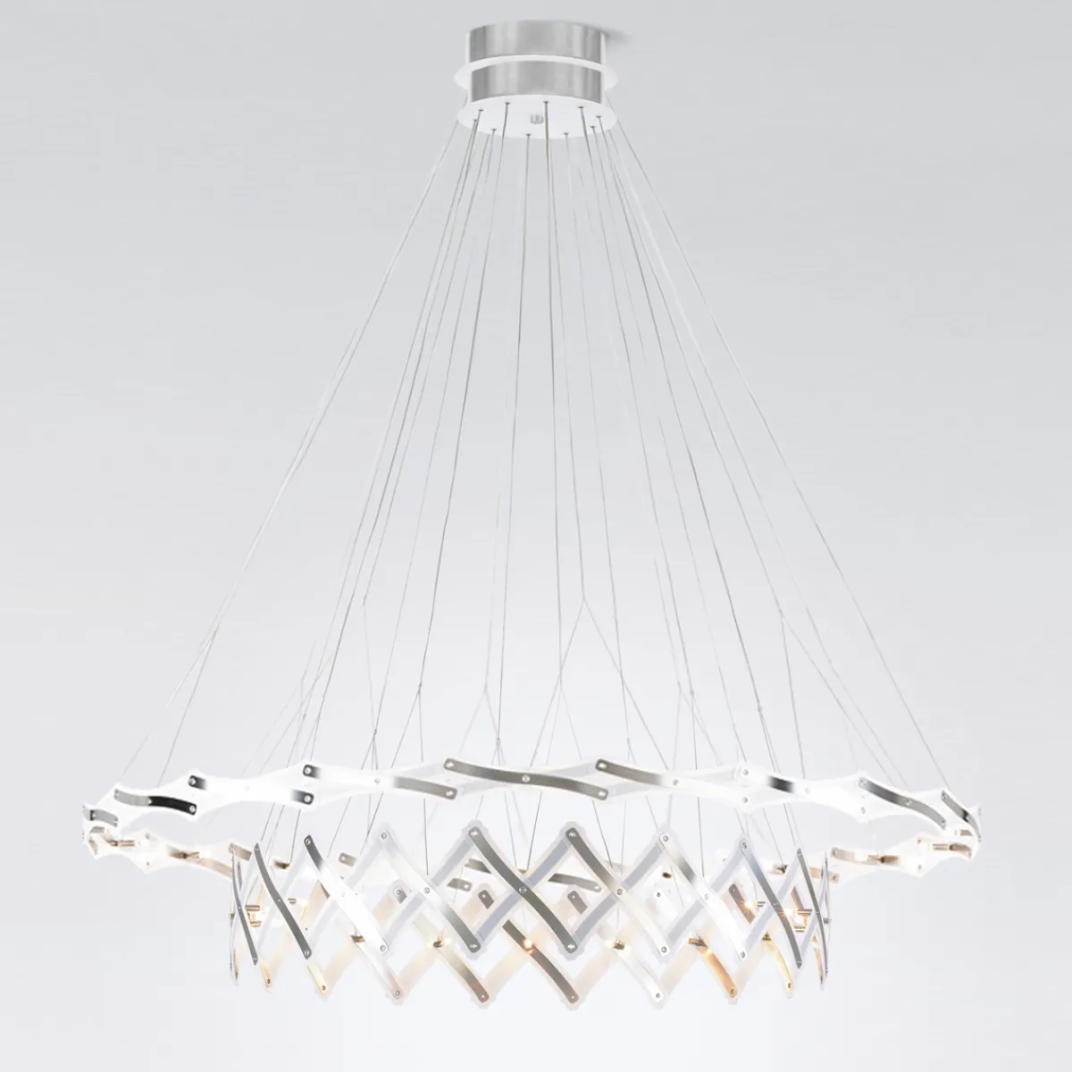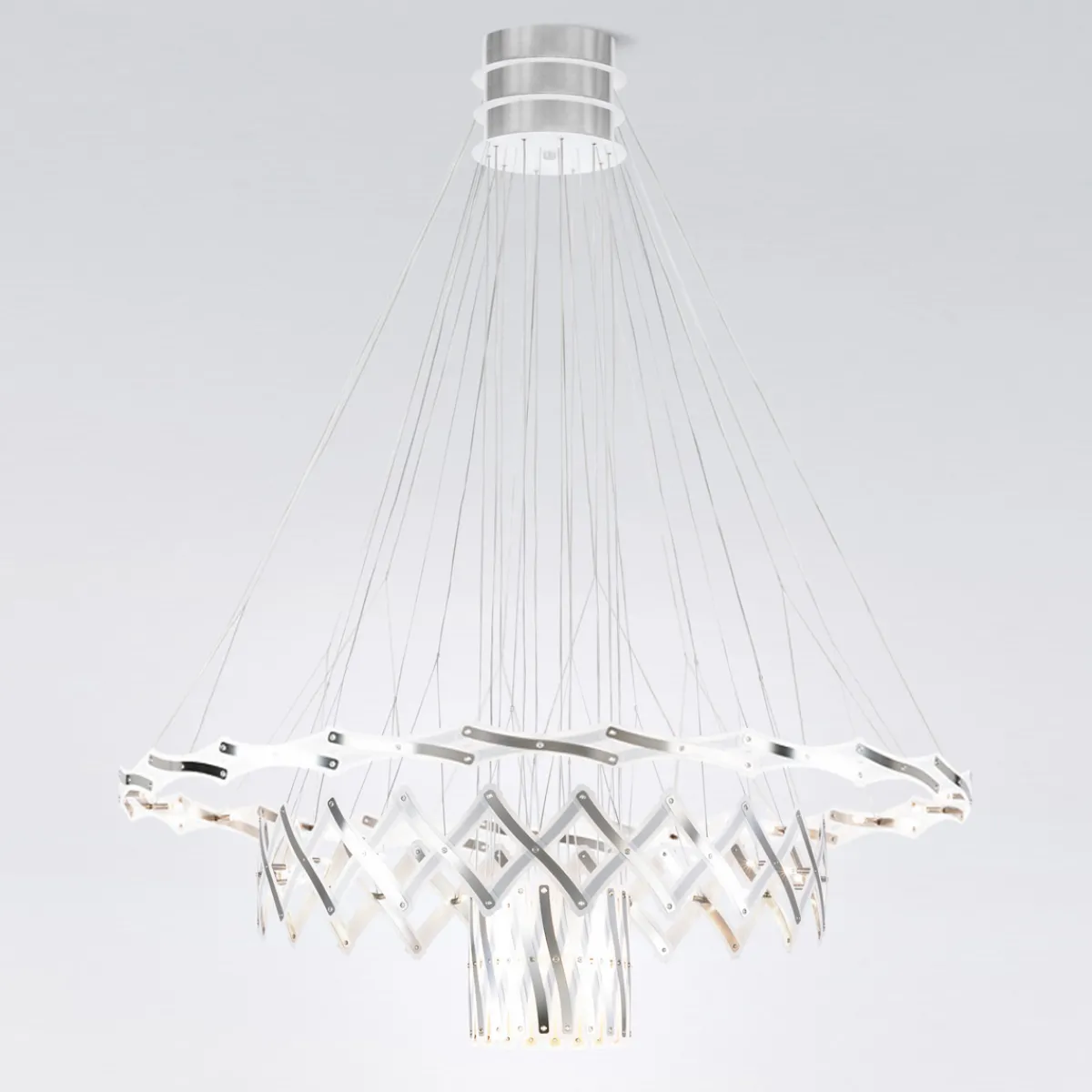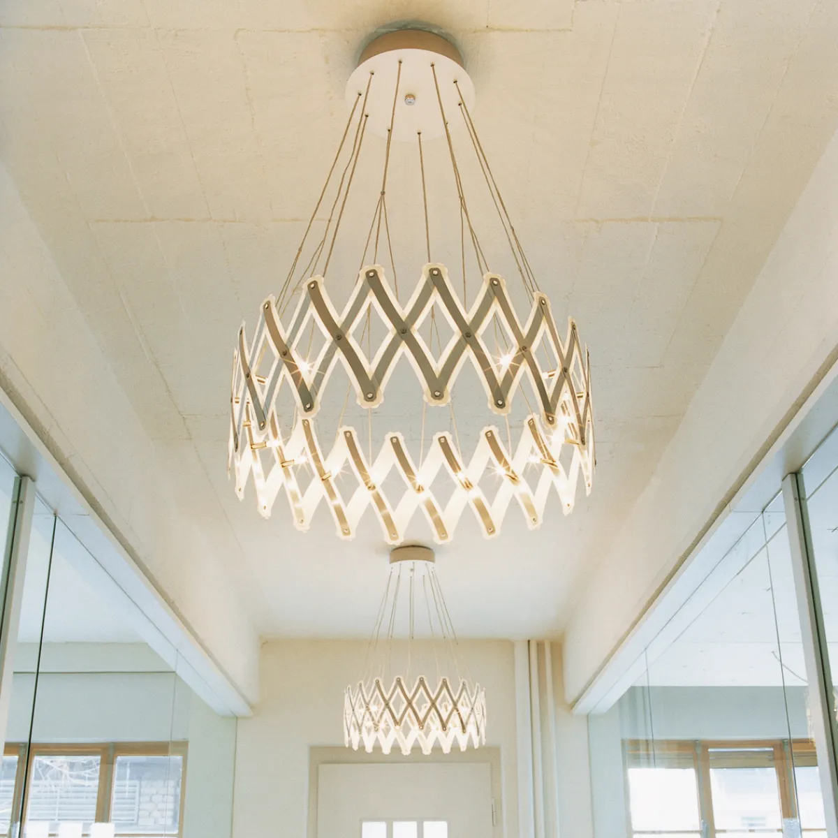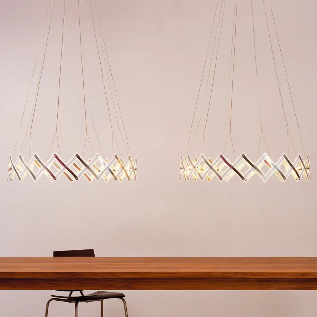 Die serien.lighting Zoom Pendelleuchte lässt sich ästhetisch sowie lichttechnisch den unterschiedlichen räumlichen Gegebenheiten anpassen. Sie ist eine zum Kreis geschlossene Scherengitterkonstruktion, die in ihrem Durchmesser stufenlos verstellt und zu beachtlichen Größen aufgezogen werden kann: von anfänglich 20 cm bis zu einem Durchmesser von 1,30 m.