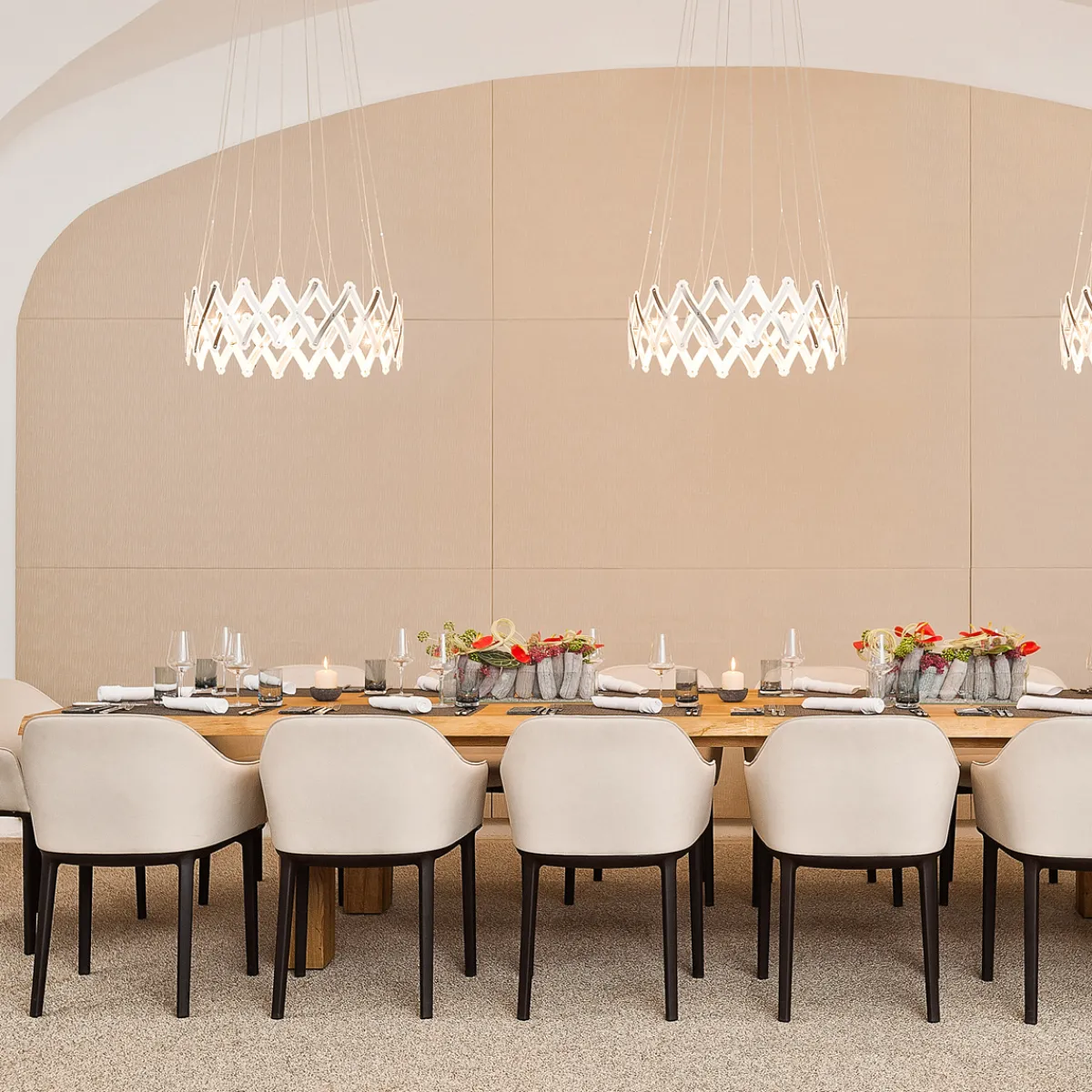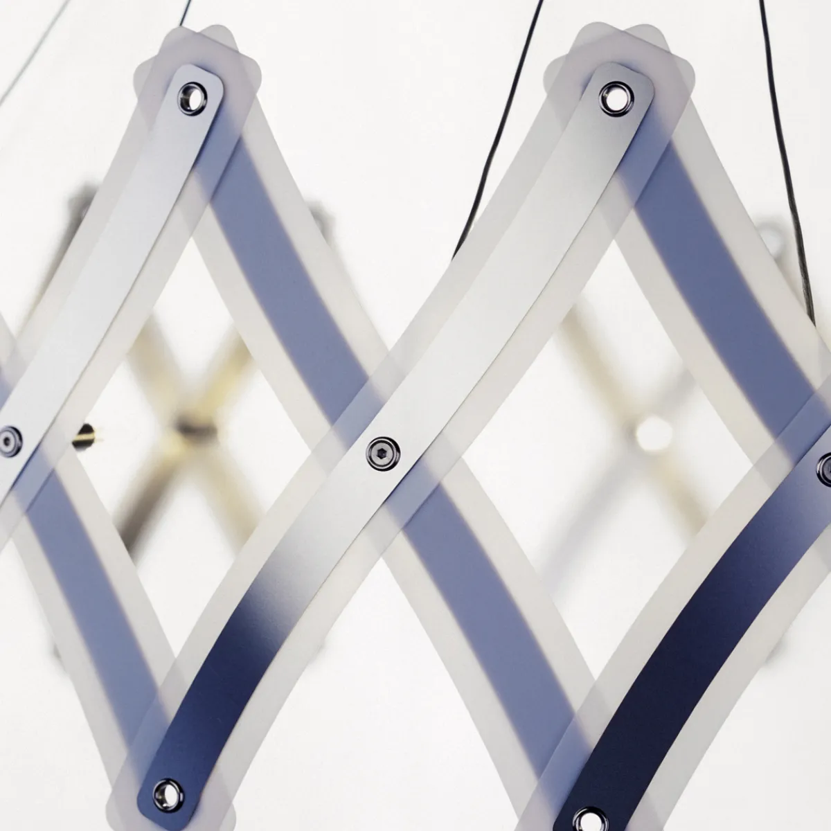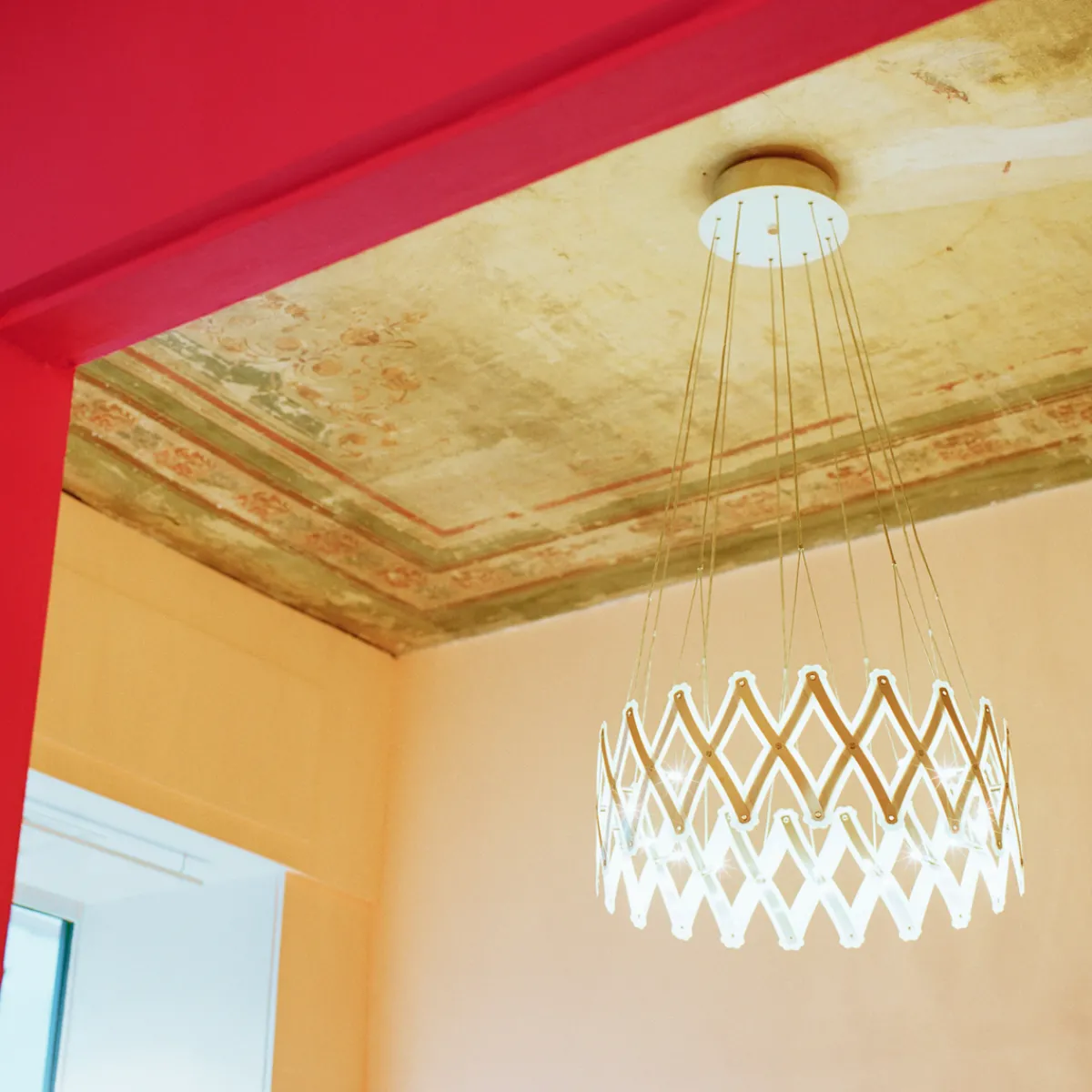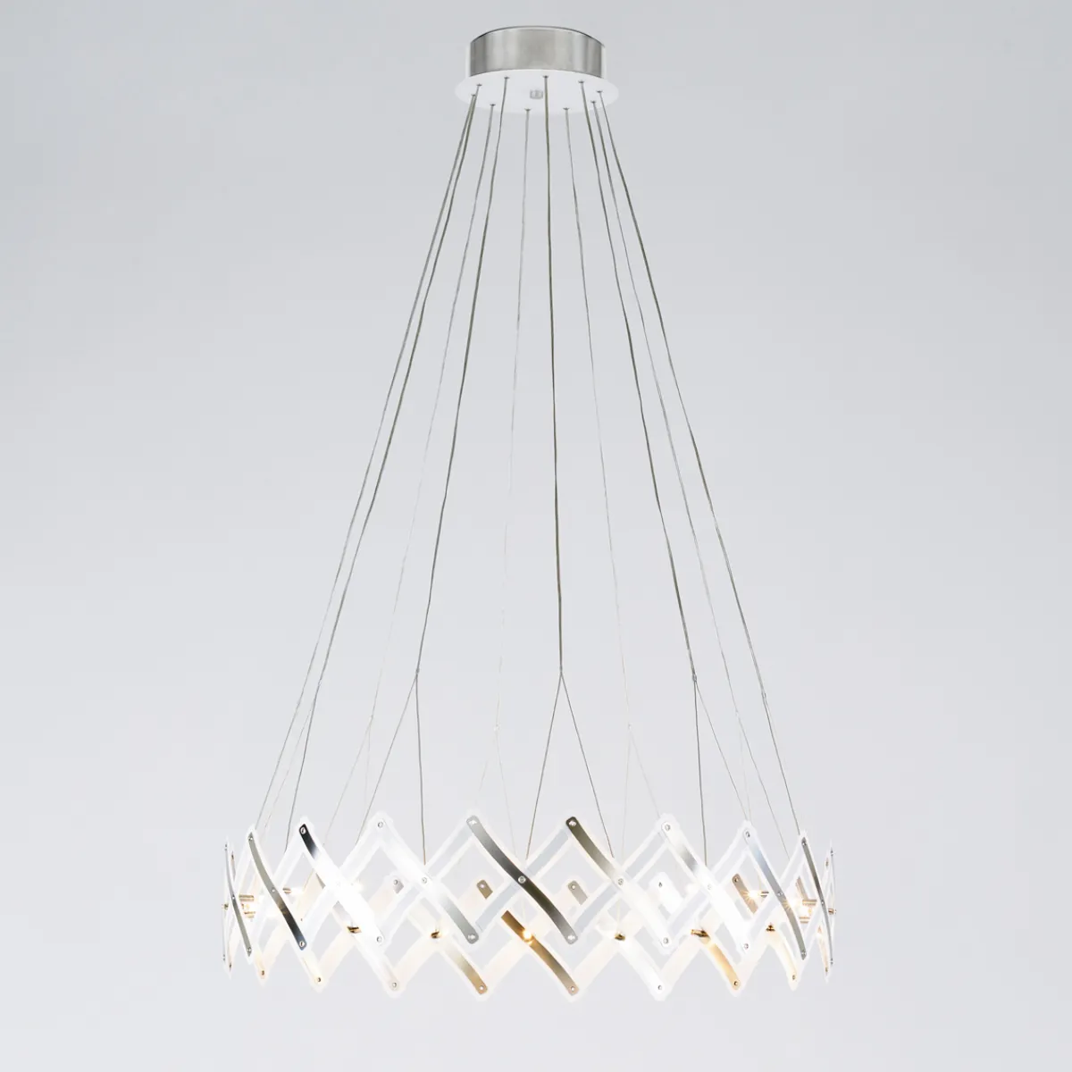 Die serien.lighting Zoom Pendelleuchte lässt sich ästhetisch sowie lichttechnisch den unterschiedlichen räumlichen Gegebenheiten anpassen. Sie ist eine zum Kreis geschlossene Scherengitterkonstruktion, die in ihrem Durchmesser stufenlos verstellt und zu beachtlichen Größen aufgezogen werden kann: von anfänglich 20 cm bis zu einem Durchmesser von 1,30 m.