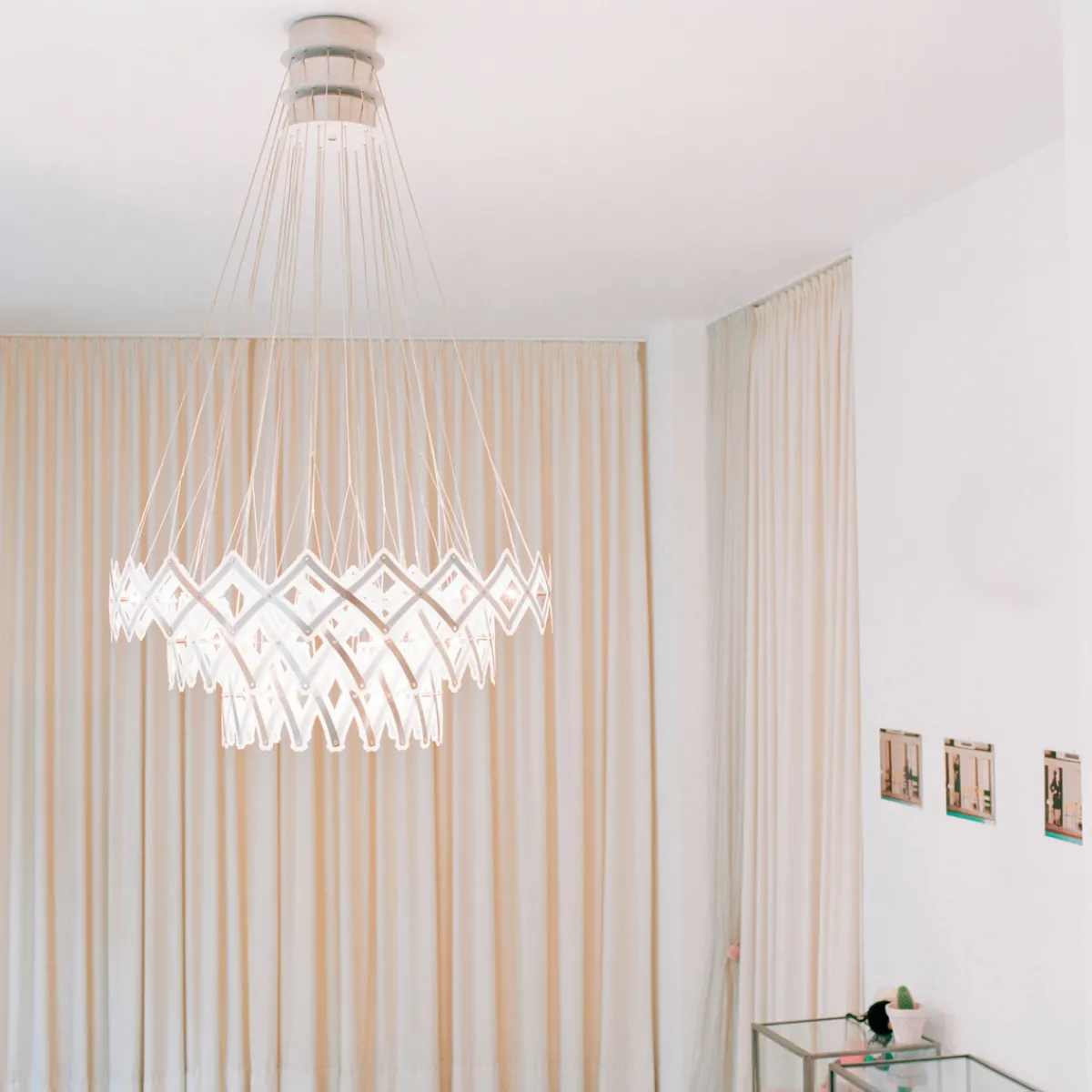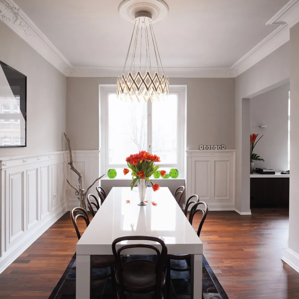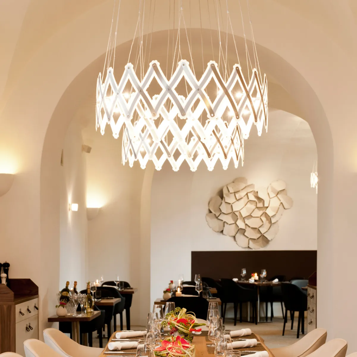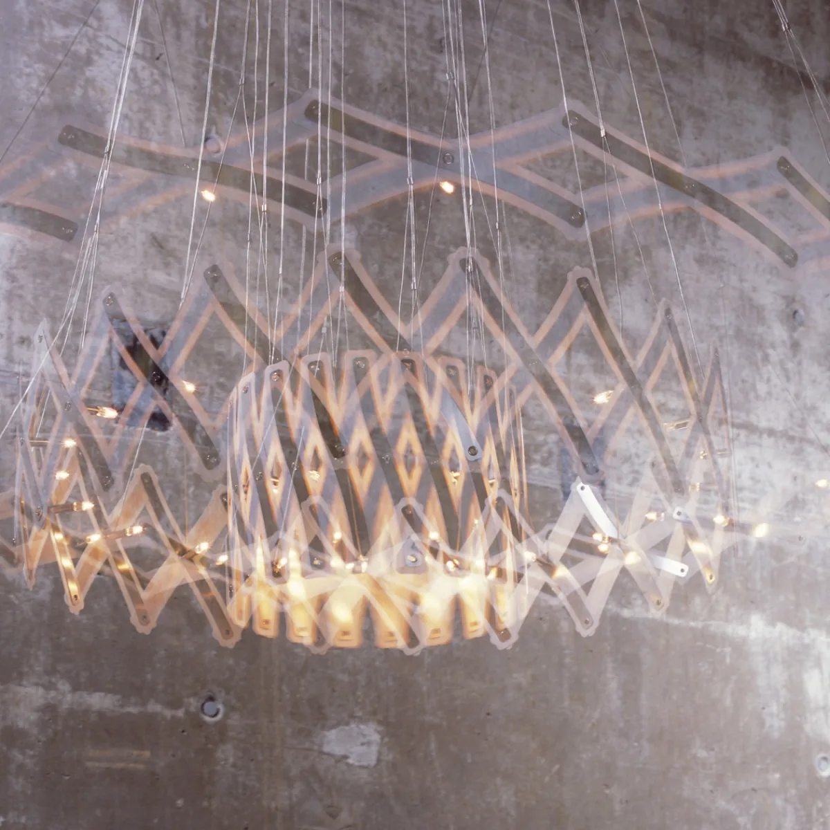 Die serien.lighting Zoom Pendelleuchte lässt sich ästhetisch sowie lichttechnisch den unterschiedlichen räumlichen Gegebenheiten anpassen. Sie ist eine zum Kreis geschlossene Scherengitterkonstruktion, die in ihrem Durchmesser stufenlos verstellt und zu beachtlichen Größen aufgezogen werden kann: von anfänglich 20 cm bis zu einem Durchmesser von 1,30 m.