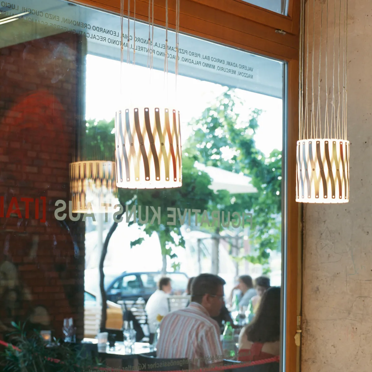 Besondere Ausdruckskraft gewinnt die Pendellampe in ihrer Version mit zwei oder drei Leuchtenschirmen. Untereinander gehängt und zu unterschiedlichen Öffnungsweiten aufgezogen, verschmelzen diese zu einem neuartigen Objekt, das sich für all jene Räumlichkeiten eignet, in denen ein visueller sowie stimmungsvoller Blickpunkt gewünscht wird: im Esszimmer, Wohnbereich, Restaurant oder Sitzungssaal.
