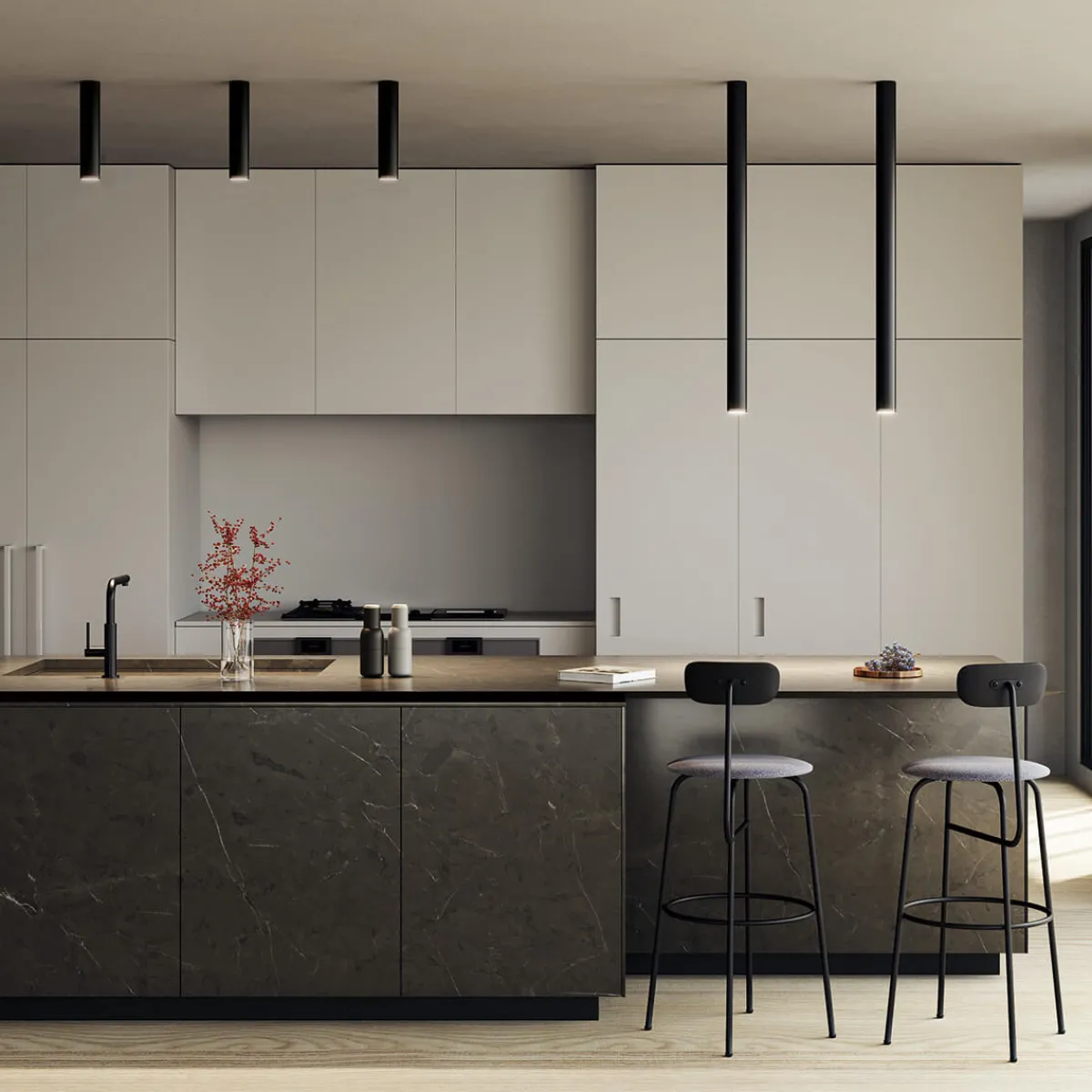 Setzen Sie die A-Tube als Decken- oder Pendelleuchte einzeln oder in Kombination ein, um lebendige Lichtarrangements zu schaffen. Die Deckenleuchte ist in vier Längen (14 cm, 30 cm, 60 cm, 100 cm) erhältlich.