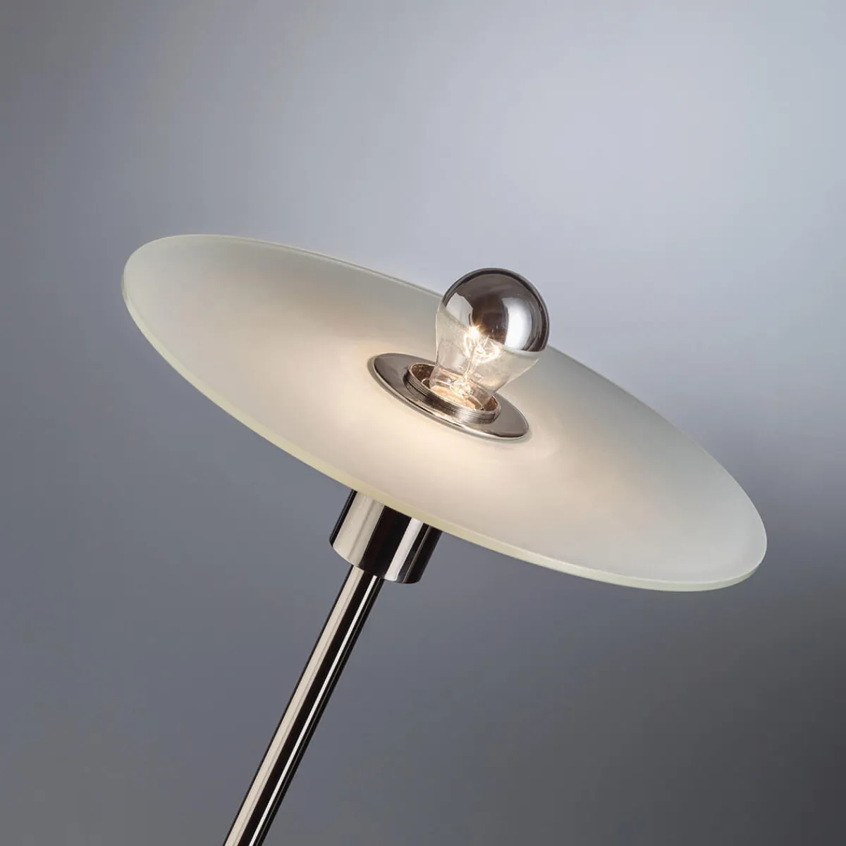| Material/Oberfläche: | Messing vernickelt, Fuß: Eisen schwarz lackiert, Schirm: Glasscheibe ätzmatt |
