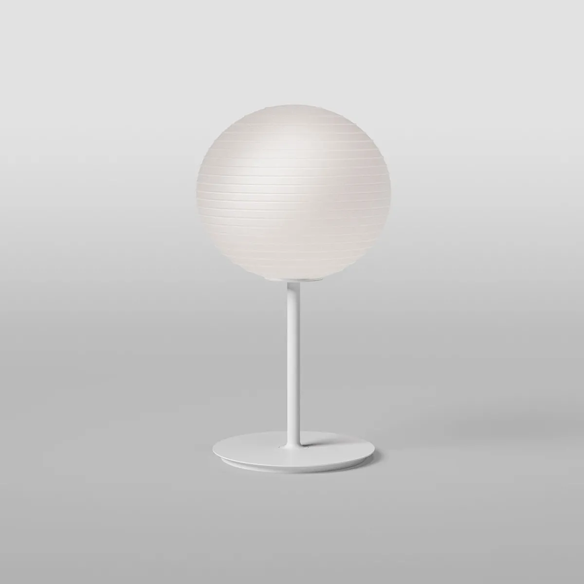 - Runde Tischleuchte mit einem filigranen Stab und einem flachen Sockel, das Design des Lampenschirms erinnert an die orientalischen Laternen aus Papier