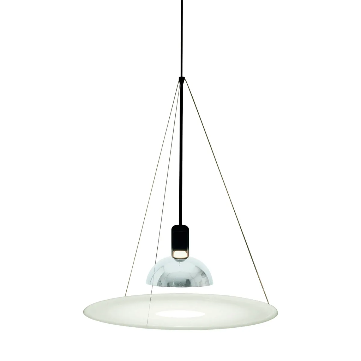 Über zarte Stahlseile ist die Diffusorscheibe der mit der Haltestruktur verbunden, sodass sie scheinbar schwerelos im Raum zu schweben scheint. Der halbkugelförmige Reflektor ist aus glanzvoll verchromtem Metallblech kreiert und zum Zwecke einer größtmöglichen Reflektion an seiner Innenseite weiß lackiert. Haltestruktur und Deckenrosette der Flos Frisbi Pendelleuchte bestehen aus schwarz lackiertem ABS.