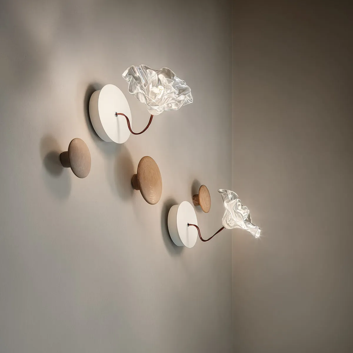 Das Ergebnis ist ein warmer Schimmer von poetischer Qualität, der die vor allem im Korridor oder Eingangsbereich zu einem echten Blickfang macht. Nicht weniger schön macht sich die LaFleur Applique neben dem Bett, wo sie als originelle Alternative zur Nachttischlampe für eine behagliche Beleuchtung sorgt.
