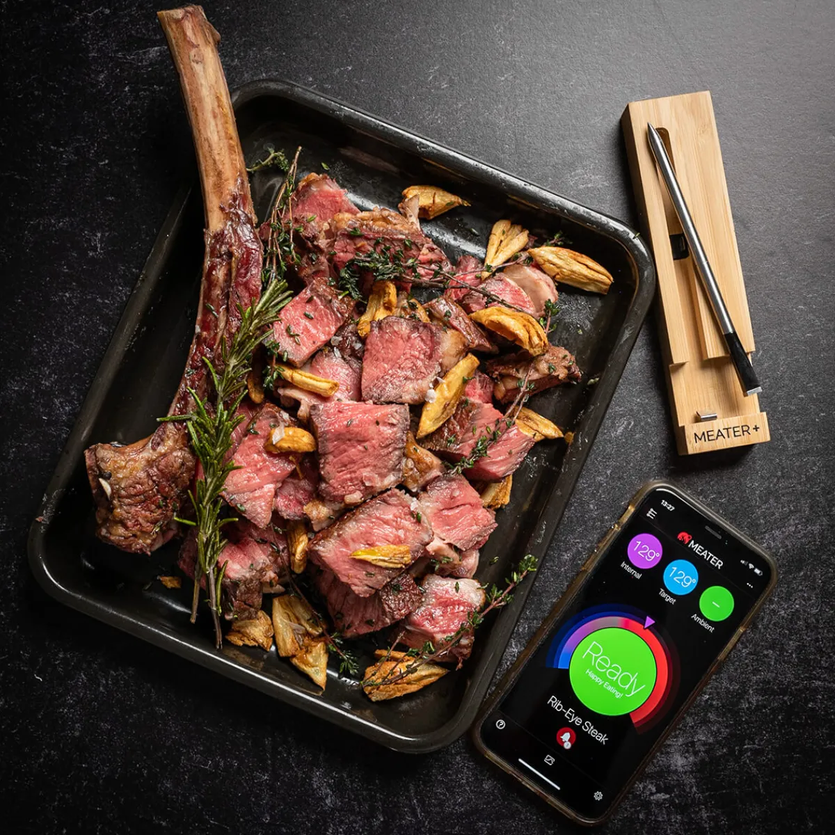 Wie MEATER Plus funktioniert? Einfach den Temperaturfühler in das Gargut stecken, Fleischsorte und gewünschten Garzustand in der Meater App auswählen und den Garprozess starten. Der innovative Algorithmus berechnet Gar- und Ruhezeiten und hält Sie über den Fortschritt des Garvorgangs auf dem Laufenden. So können Sie sich entspannt zurücklehnen, während Steak, Hähnchen und Fisch auf den Punkt genau gegart werden.