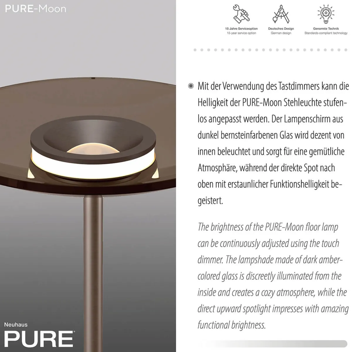 Die PURE Moon LED-Stehleuchte vereint zeitlose Eleganz mit moderner Technologie und stellt einen besonderen Fokus auf die Kombination von Ästhetik und Funktionalität. Die Stehleuchte, die in Bronze mit einem dunklen Bernsteinglas erhältlich ist, veredelt jeden Wohnraum durch ihre hochwertige Verarbeitung und das sorgfältige Design.