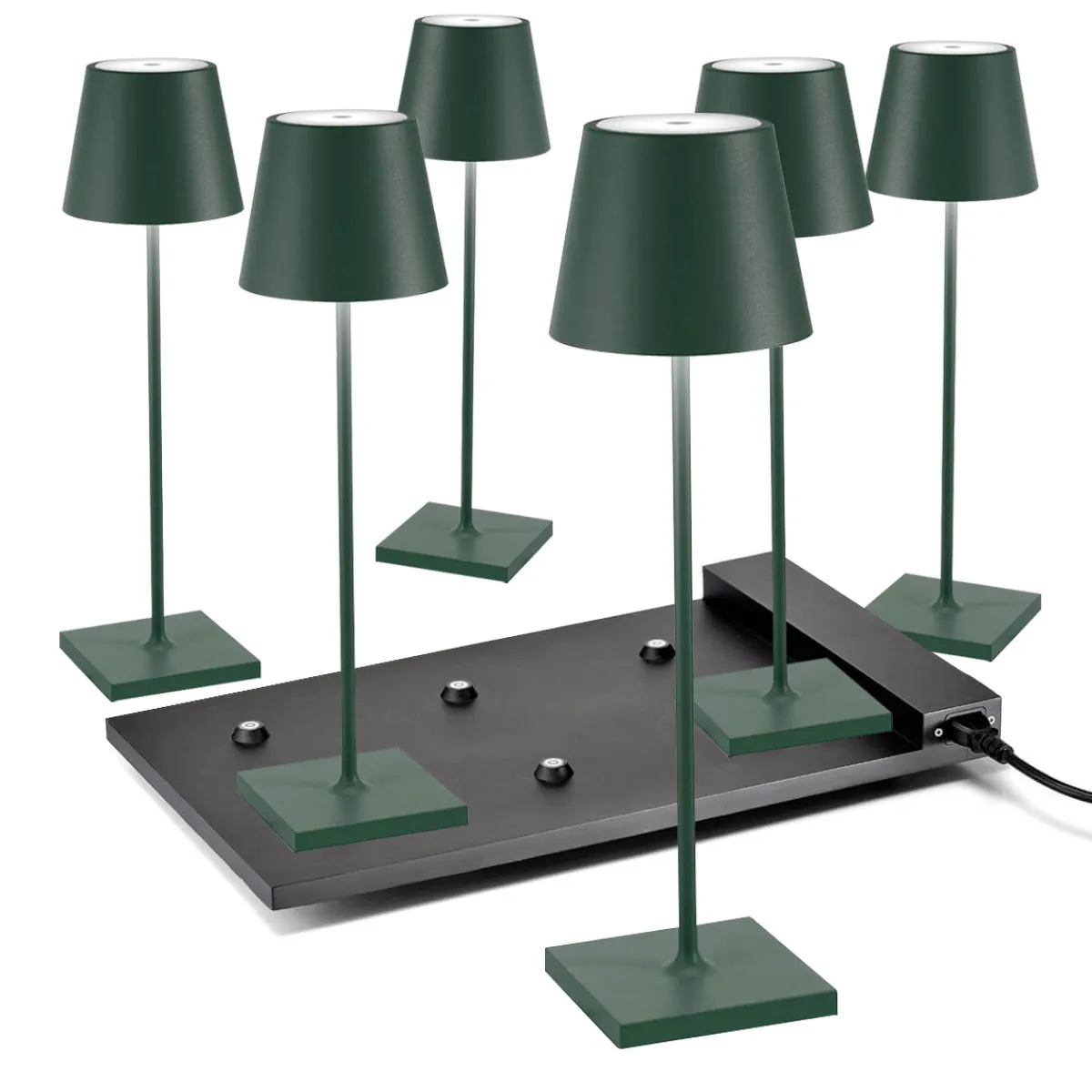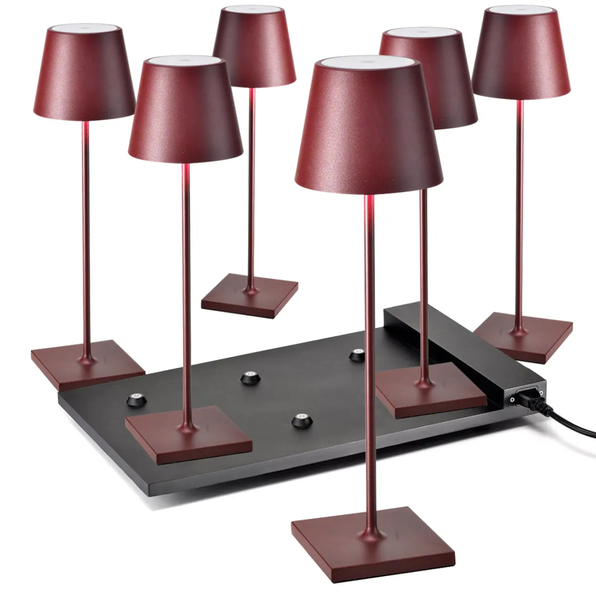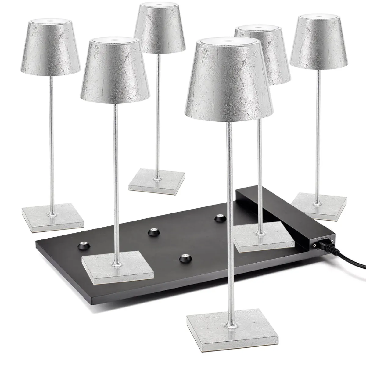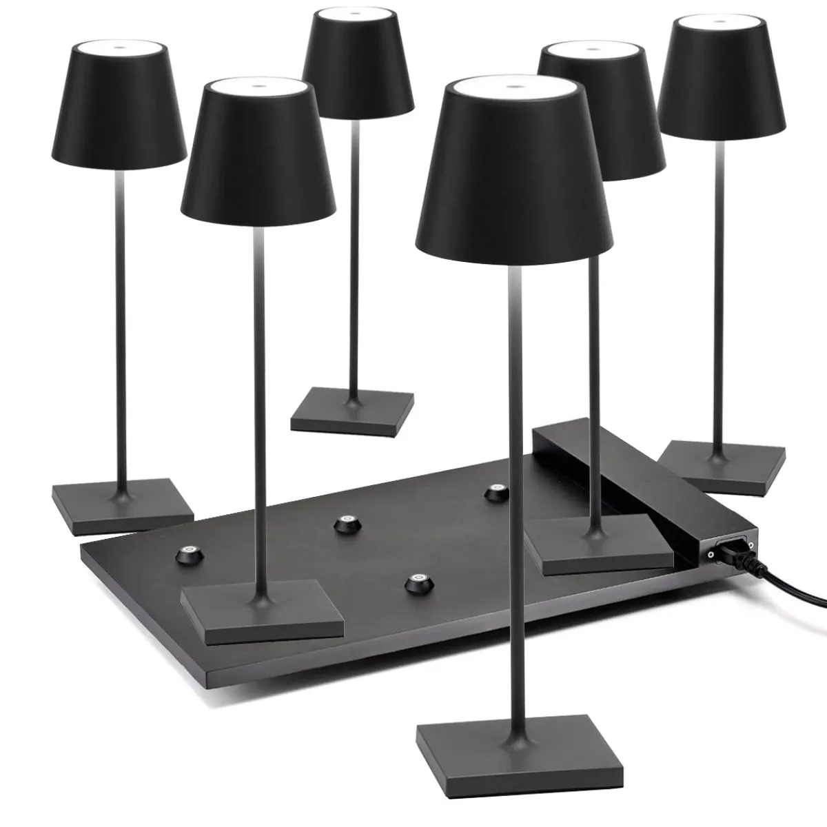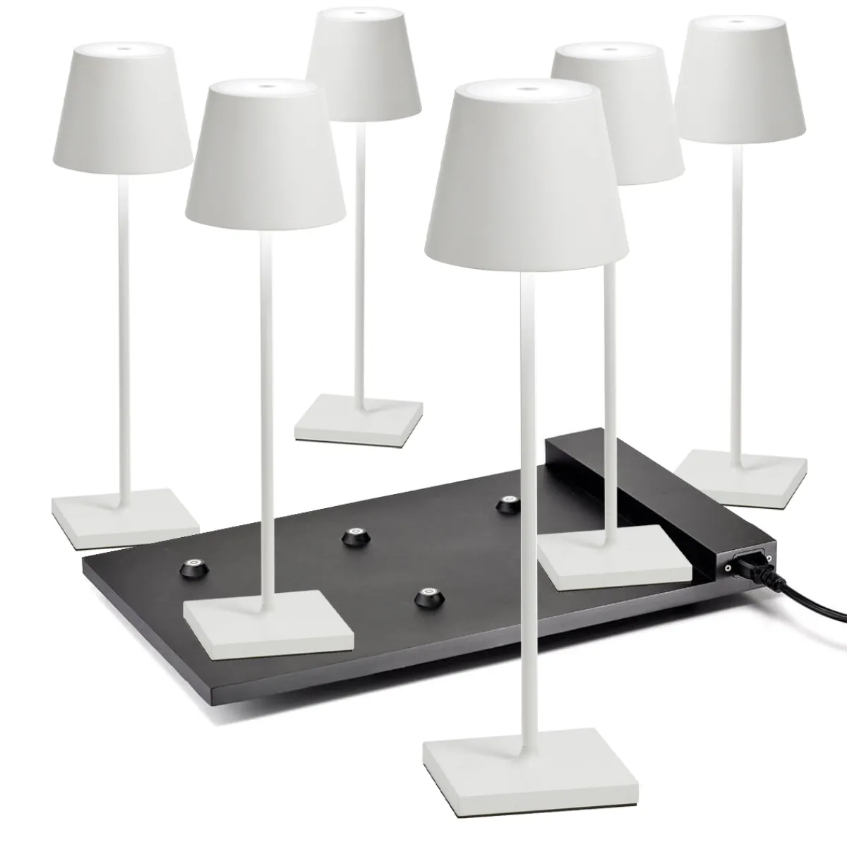 Sichern Sie sich das Original aus Italien – zum attraktiven Vorteilspreis im Bündelangebot! Das hier angebotene Set umfasst sechs kabellose Zafferano Poldina Pro Akkuleuchten, dazugehörige Einzel-Kontaktladestationen mit USB-Kabel und eine Multi-Kontaktladestation, mit der sich alle Leuchten gleichzeitig wieder aufladen lassen. Das Angebot ist perfekt für Hotellerie, Gastronomie und Catering, wo sie auf Bistrotischen, Theken und Beistelltischen dekorative Lichtpunkte setzen.