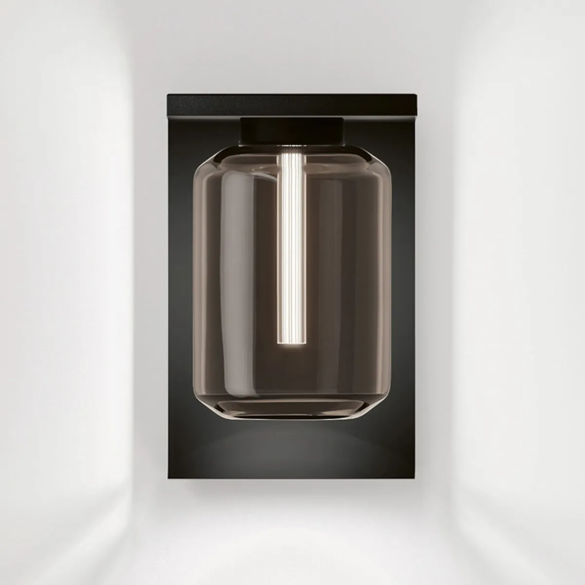 Die Dia F von .DE ist eine moderne Neuinterpretation einer klassischen Laterne. Sie hat einen geradlinigen Aluminiumrahmen und einen geblasenen Körper aus rauchfarbenem Glas.