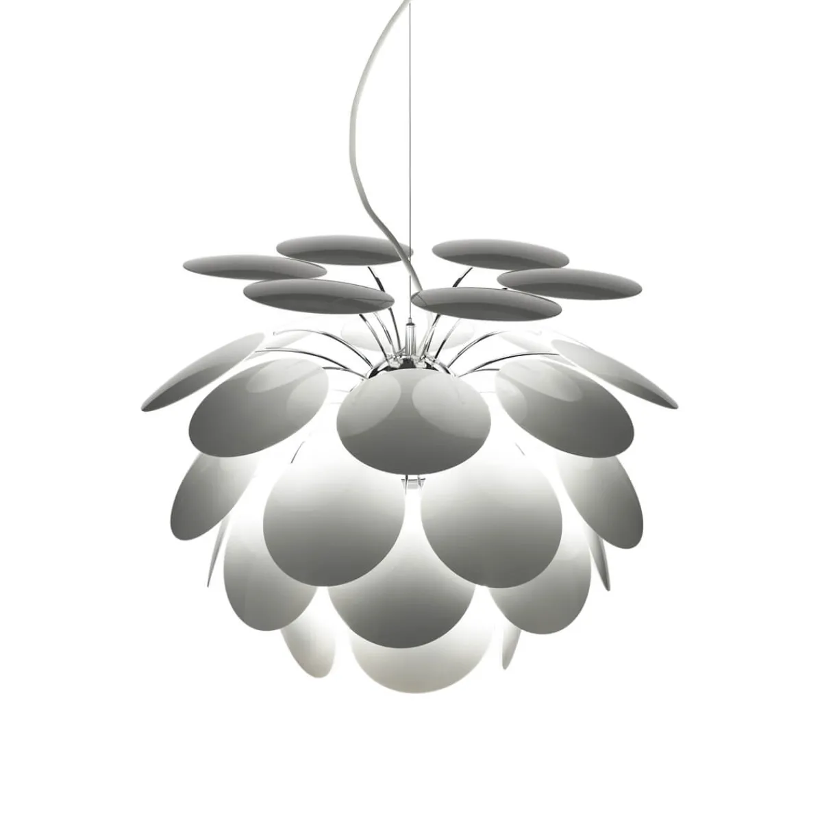 | Material/Oberfläche: | Schirme: ABS farbig, innere Sphäre: Chrom, Baldachin und Kabel: weiß |