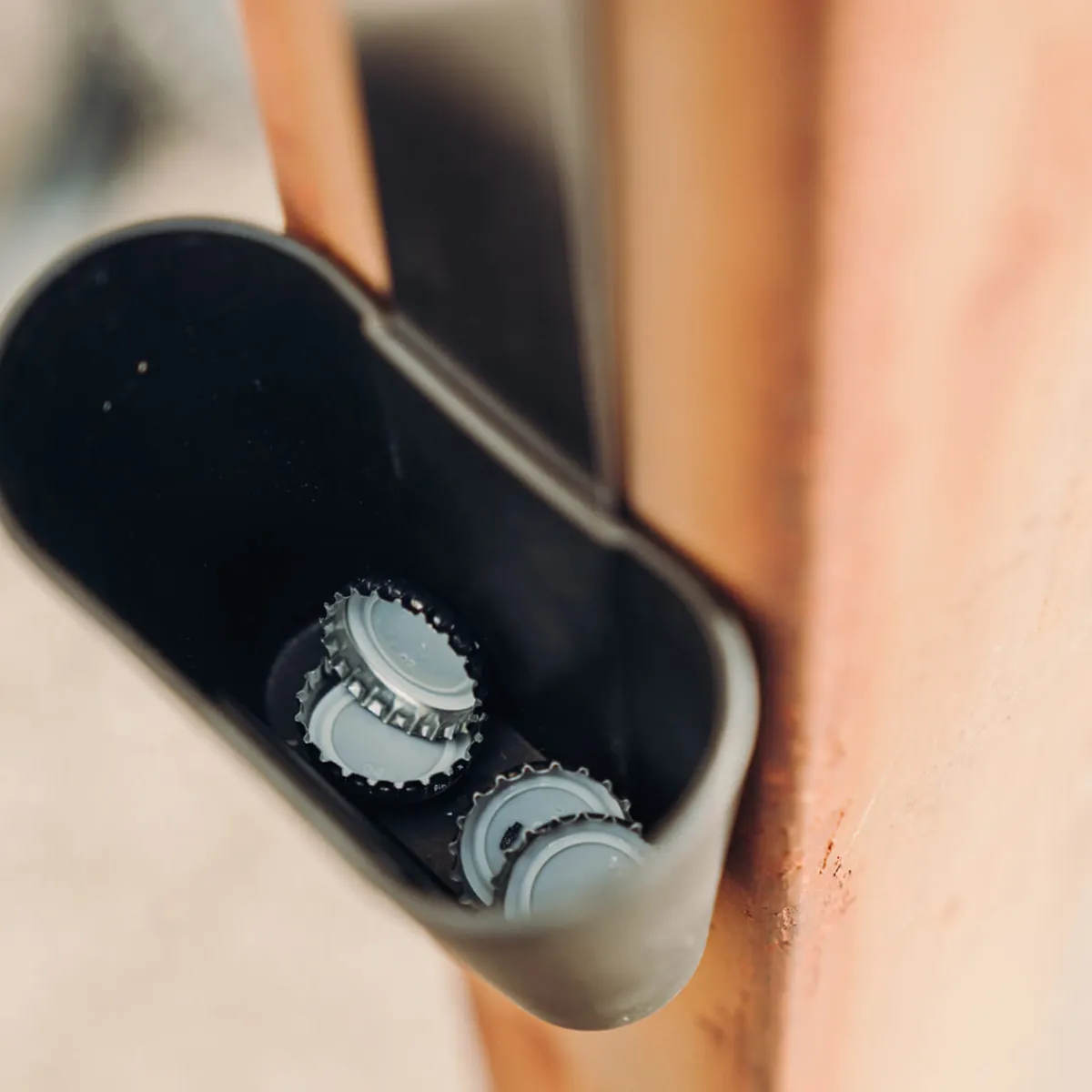 - Der abnehmbare Becher fängt ca. 60 Kronkorken