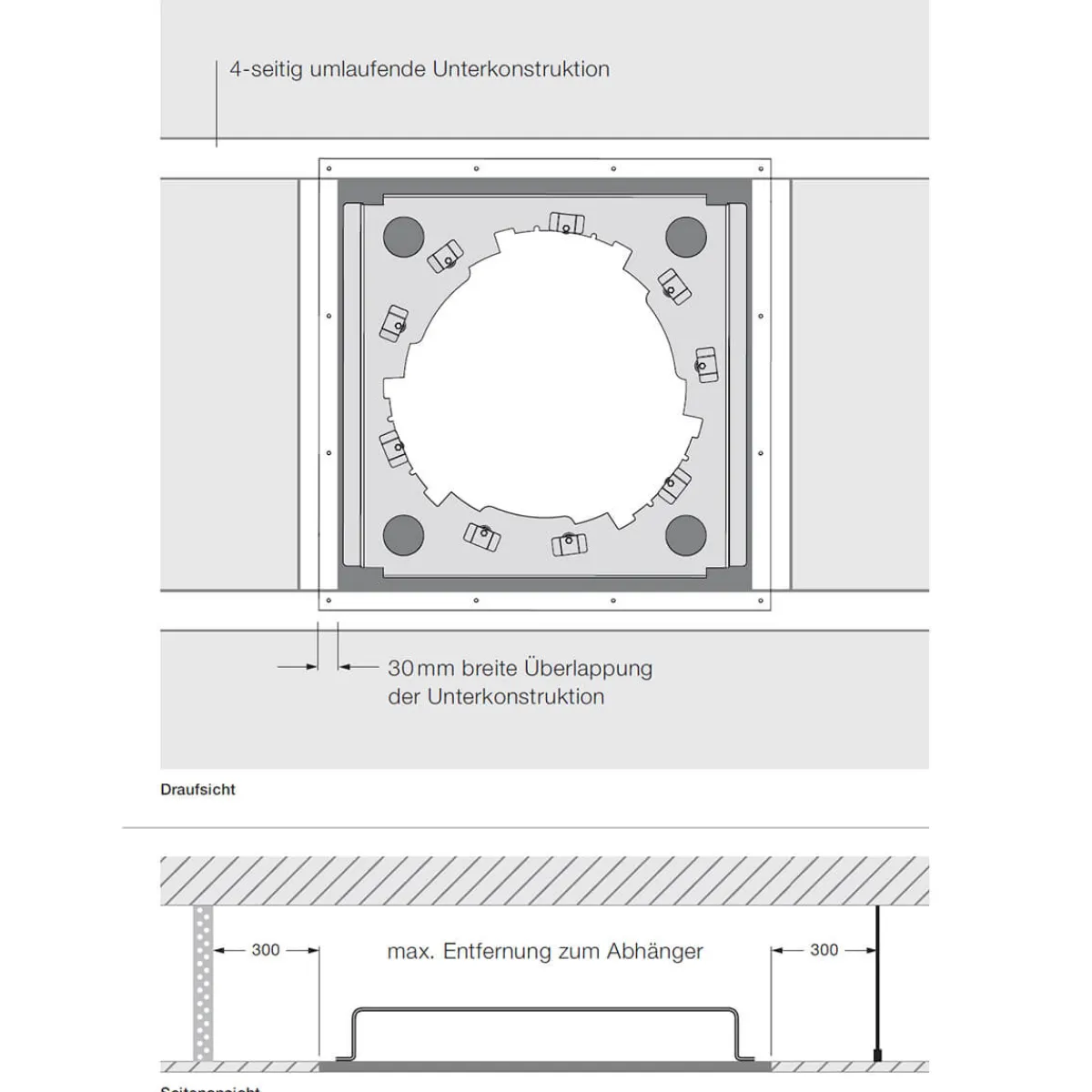 - Mit Einputzelement und light channel zur Montage in Hohlraumdecken