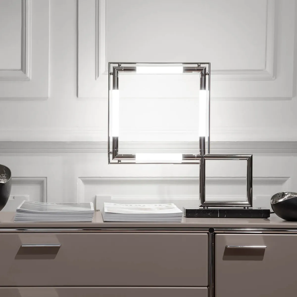 Ob als Blickfang auf dem Sideboard im Wohnzimmer, als elegante Nachttischlampe im Schlafbereich, als Akzentlicht im Flur oder als repräsentatives Statement in Lobbys und Lounges – die Quadro verbindet ikonisches Design mit moderner Lichttechnik auf höchstem Niveau.