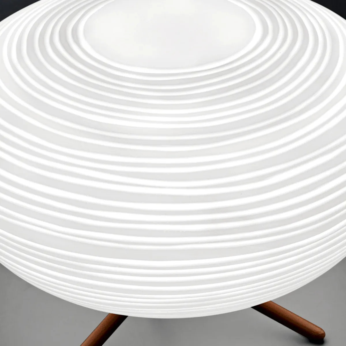 Horizontale Furchen, welche die Oberfläche der Leuchten zieren, lassen ein weiches und faszinierendes Dekor entstehen und tragen dazu bei, ein warmes und volles Licht zu erzeugen. Die Bearbeitung des Glases, der besondere Schleifeffekt, erschafft hierbei je nach Tiefe der Einschnitte neuartige Hell-Dunkel-Effekte. Als Basis dient einer jeden Foscarini Rituals Tavolo Tischleuchte ein dreibeiniges Untergestell aus lackiertem Metall.