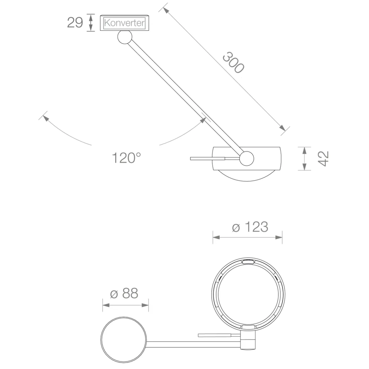 - Body um 180° drehbar und Arm um 120° schwenkbar