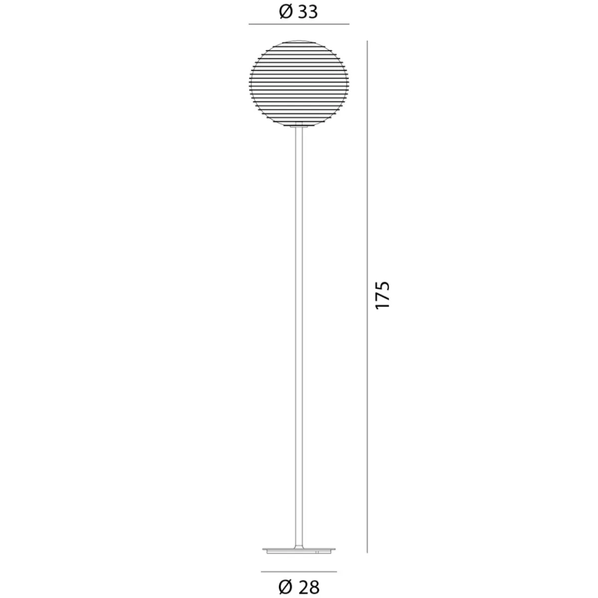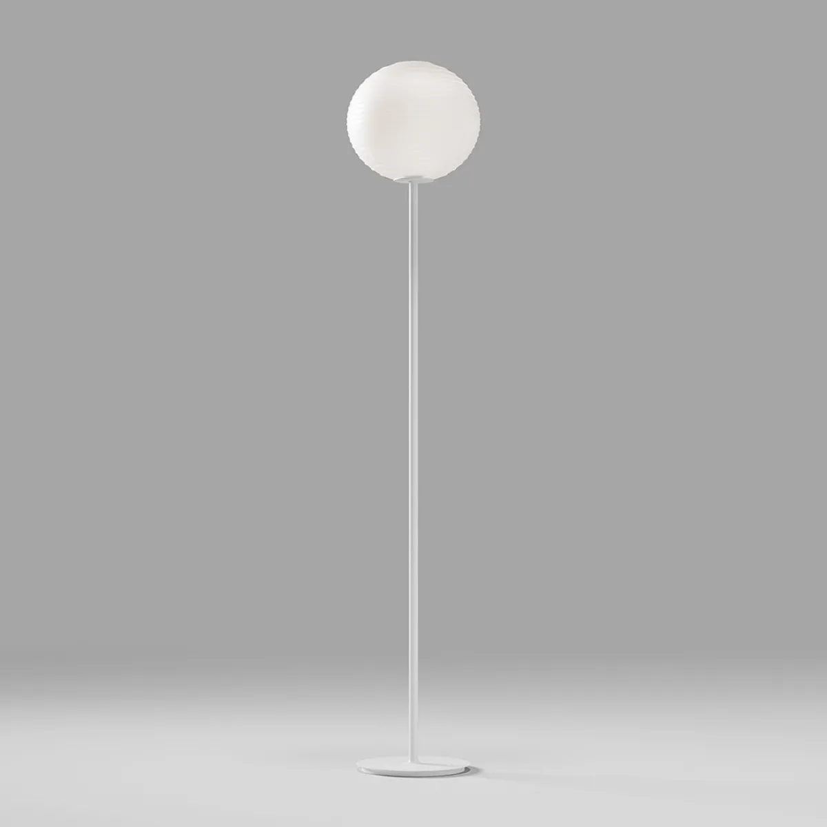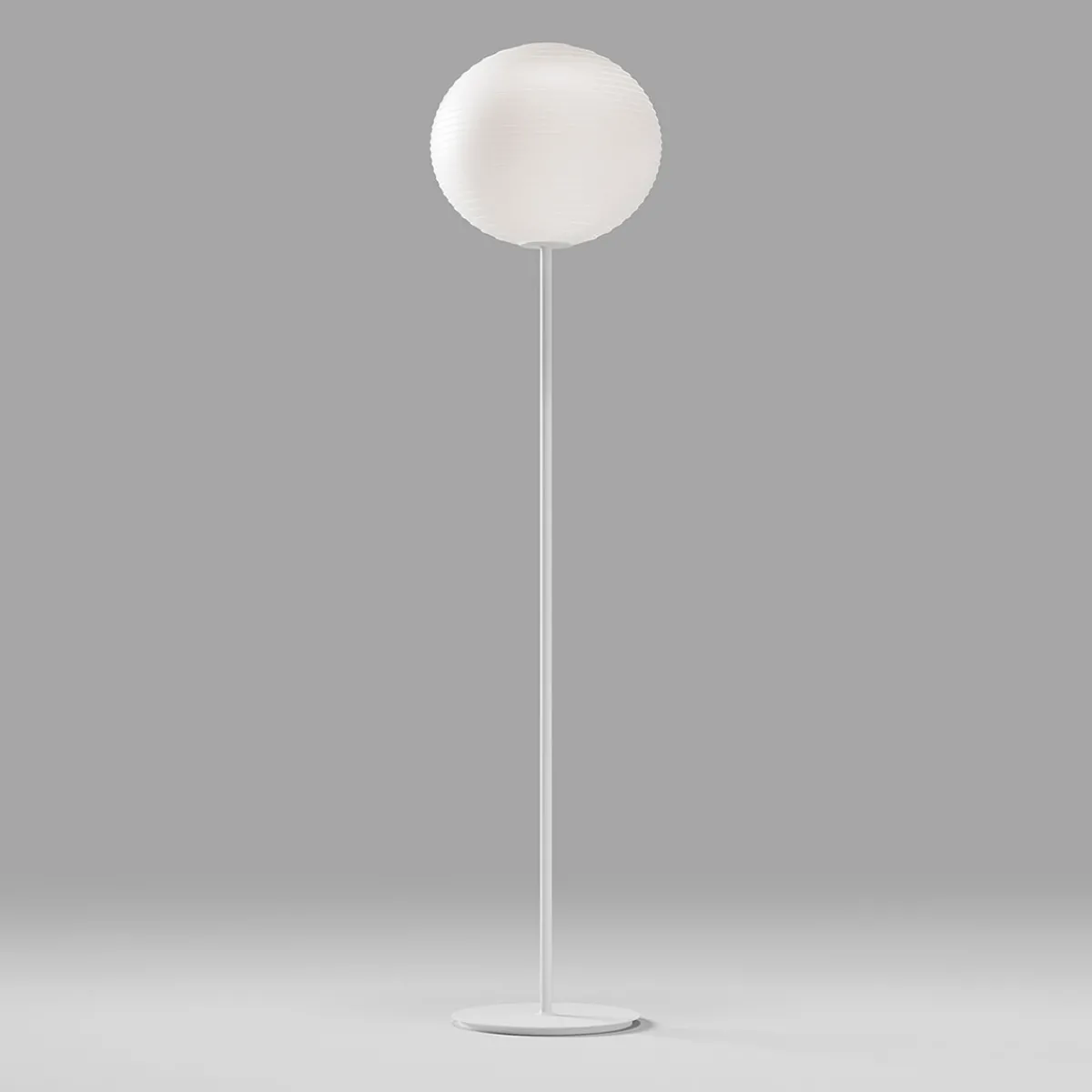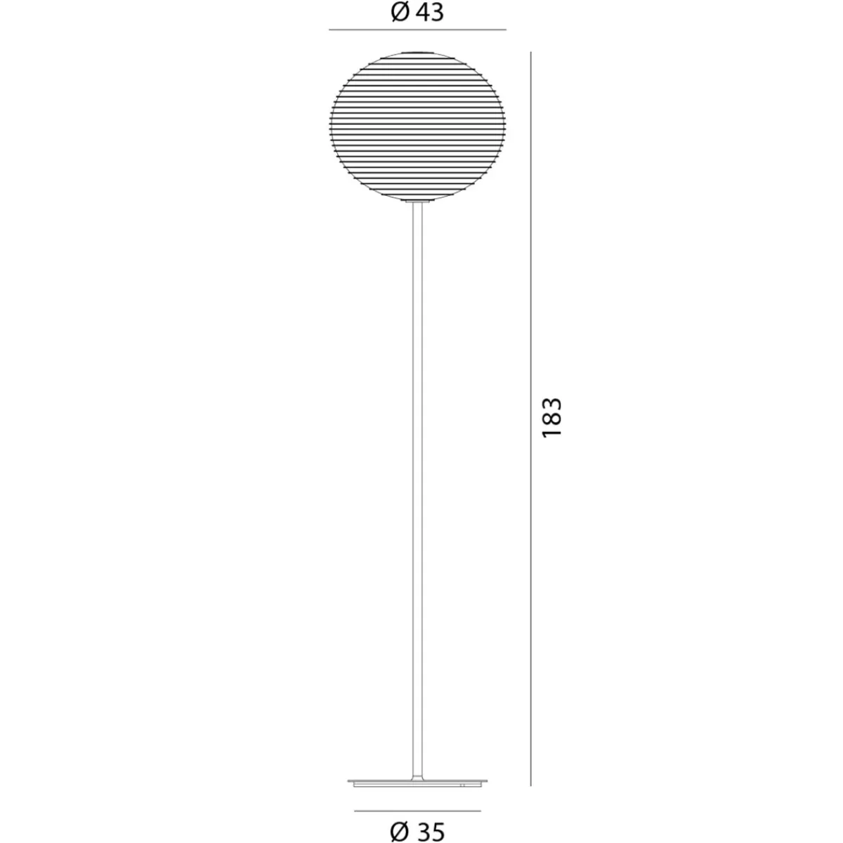- Runde Stehleuchte mit filigranem Stab und einem flachen Sockel, das Design des Lampenschirms erinnert an die orientalischen Laternen aus Papier