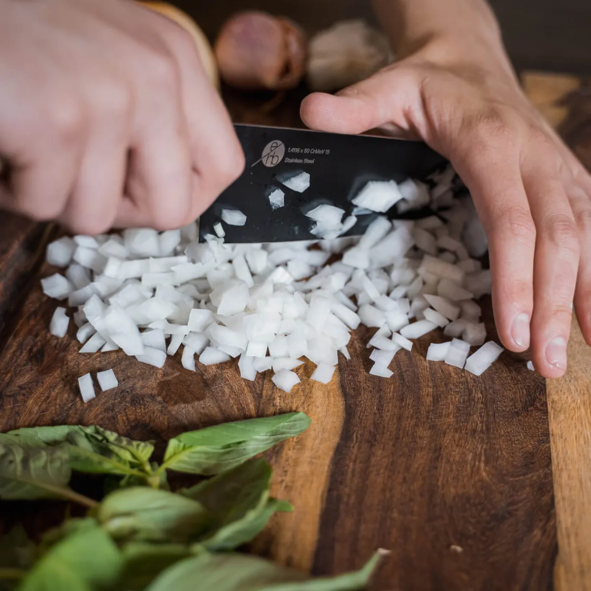 - Allzweck-Küchenmesser zum Schneiden und Hacken verschiedenster Lebensmittel (Gemüse, Fisch, Fleisch, Kräuter, Nüsse etc.)