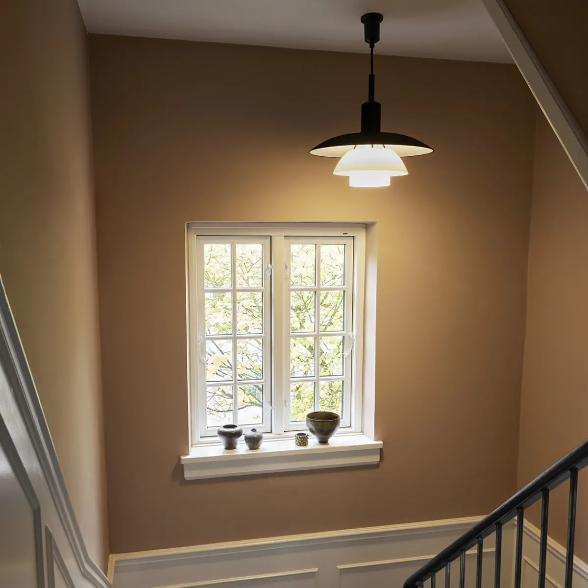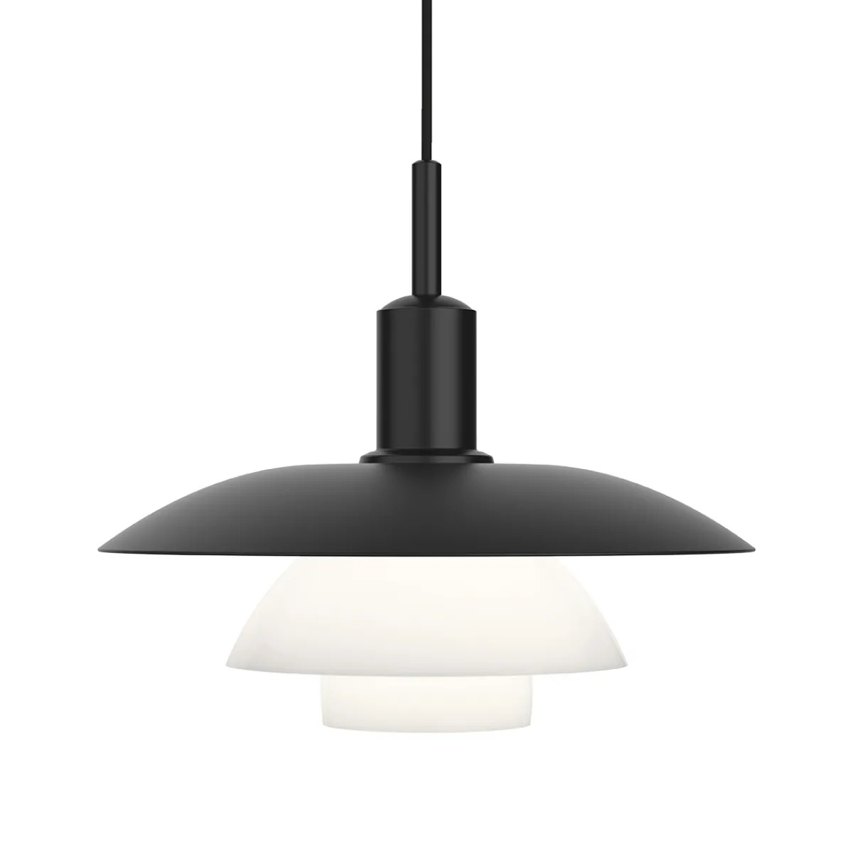 Die PH 5/5 ist in zwei Ausführungen erhältlich, die jeweils auf unterschiedliche Weise mit den Schatten spielen. Die mattschwarz lackierte Version mit weißen Innenflächen strahlt ein sanftes, vornehmlich nach unten gerichtetes Licht ab. Bei der mit metallenem Oberschirm wiederum wird ein schöner Kontrast zu den beiden unteren Schirmen aus durchscheinendem Opalglas gebildet. So entsteht ein weicher Lichtschein mit richtungsbestimmtem Licht.
