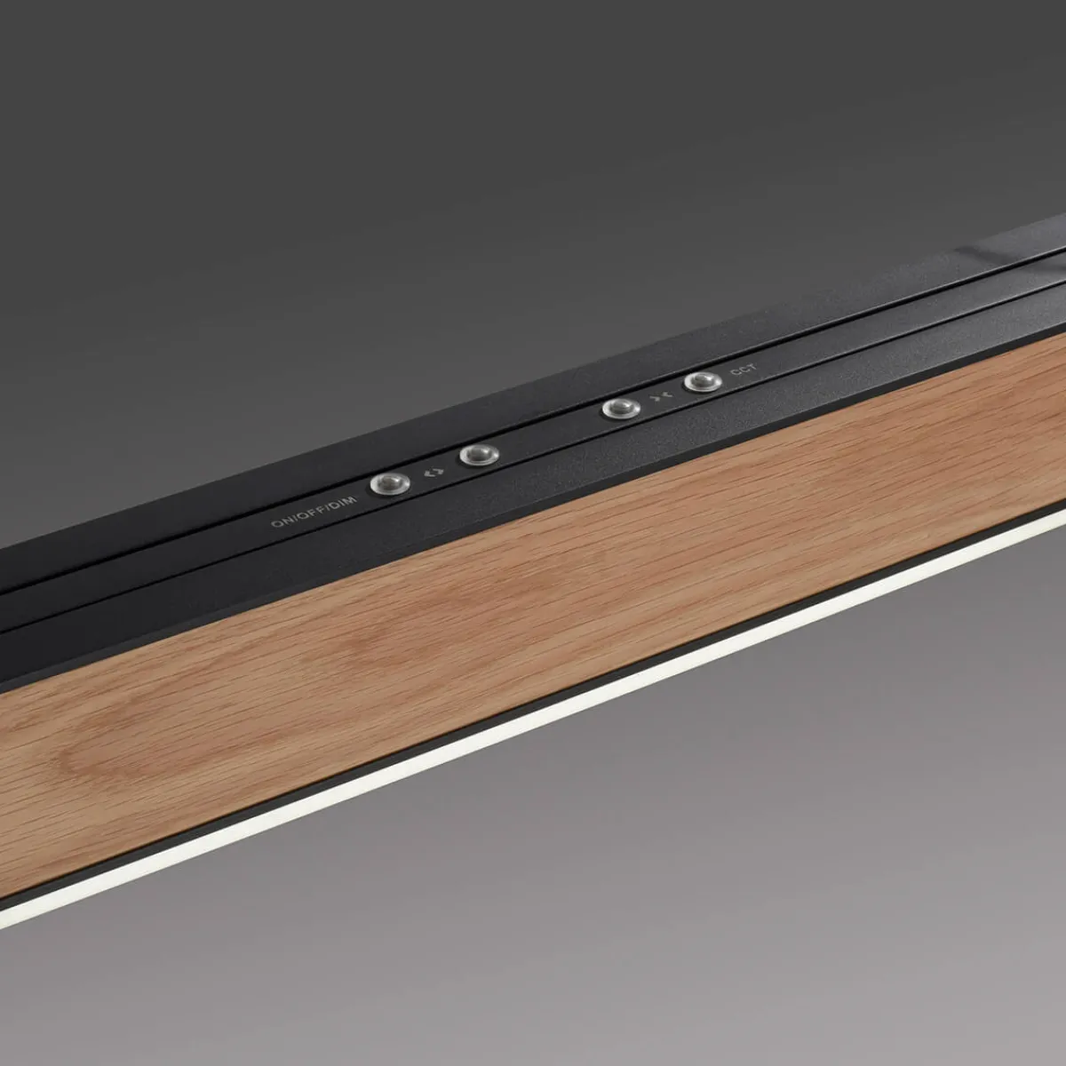 Neben der Funk-Fernbedienung lassen sich sämtliche Funktionen der PURE Moto-Rise auch über einen Touchdimmer direkt am Lampenschirm steuern: Vier unauffällig integrierte Touchflächen auf der Oberseite ermöglichen die Einstellung von , Helligkeit, Längenanpassung und Pendelhöhe – ganz einfach per Berührung. Diese Flexibilität macht die Designerlampe zu einem idealen Begleiter, sei es über dem Esstisch, einer Kücheninsel oder einem Konferenztisch.