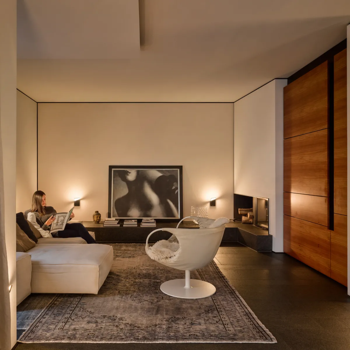 Das Licht der Nimbus Winglet CL LED erstrahlt sowohl direkt als auch indirekt. Dank des Softdiffusors aus laserstrukturiertem Acrylglas ist der Lichtaustritt angenehm weich und homogen – Garant für ein behagliches Wohlfühllicht. Auf diese Weise trägt die Wandlampe zu einer stimmungsvollen Raumbeleuchtung bei, kann mit ihrer beidseitigen jedoch auch dazu genutzt werden, Architekturen zu akzentuieren.