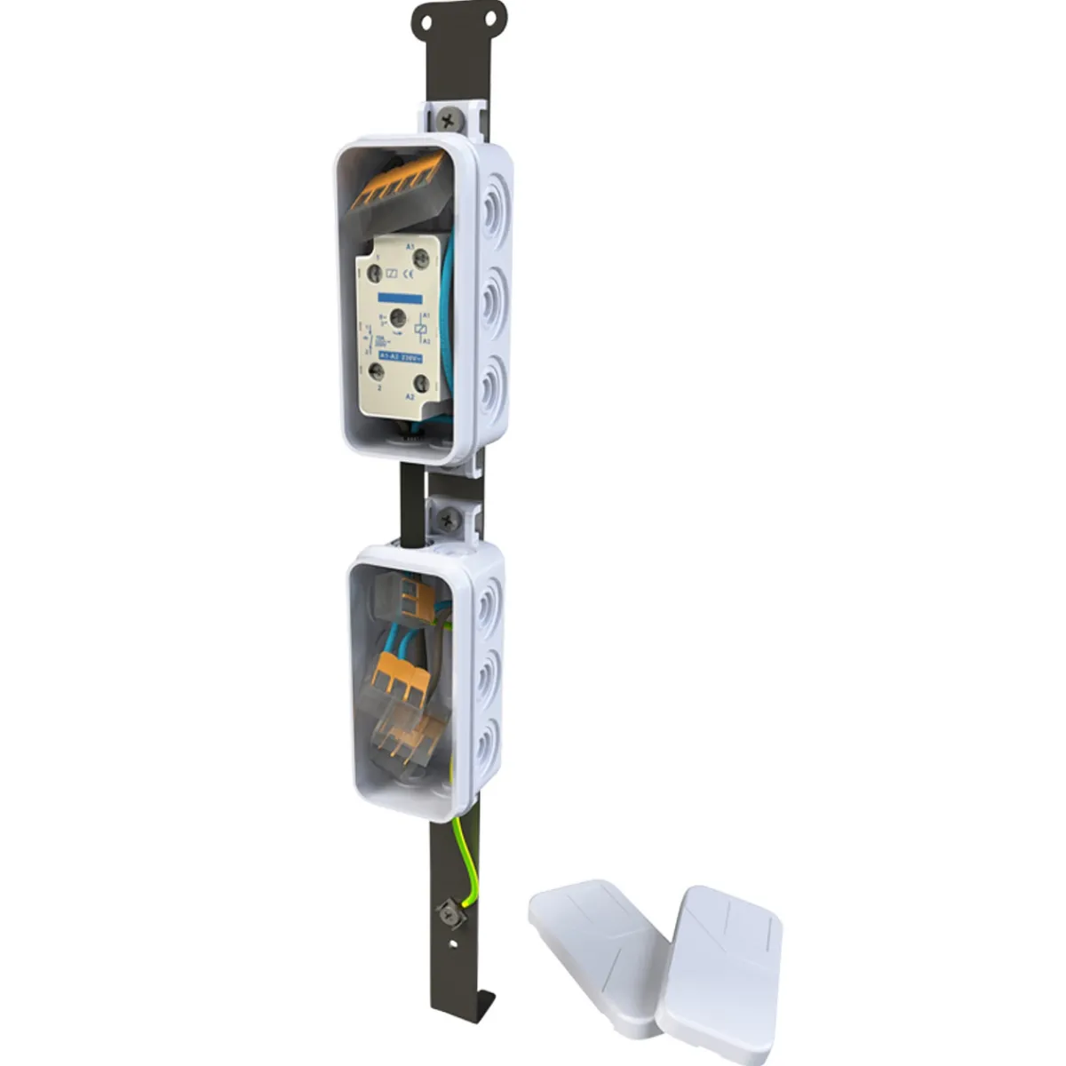 Das Kit umfasst einen Einrichtungsbügel zur stabilen Befestigung auf dem Pollerfuß oder einer Montageplatte, ein Trennrelais für die zuverlässige Signalweiterleitung, Verbindungsklemmen für eine sichere elektrische Installation sowie einen robusten Gerätekasten, der alle Komponenten sicher umschließt. Ein Schaltplan liegt der Lieferung bei, um die Installation zu vereinfachen.
