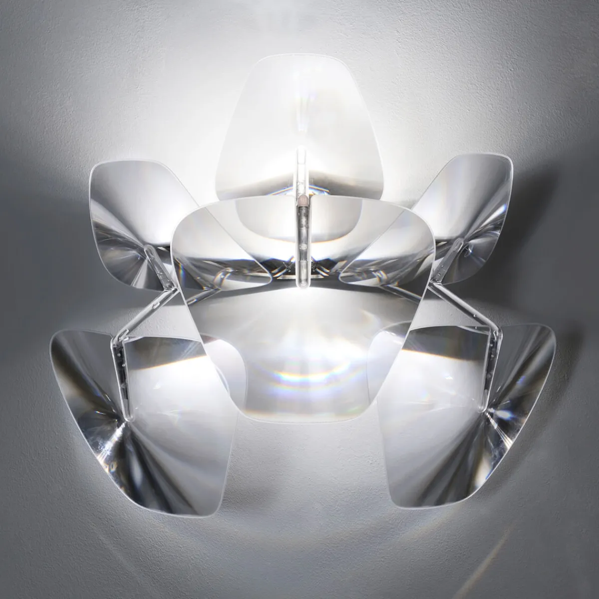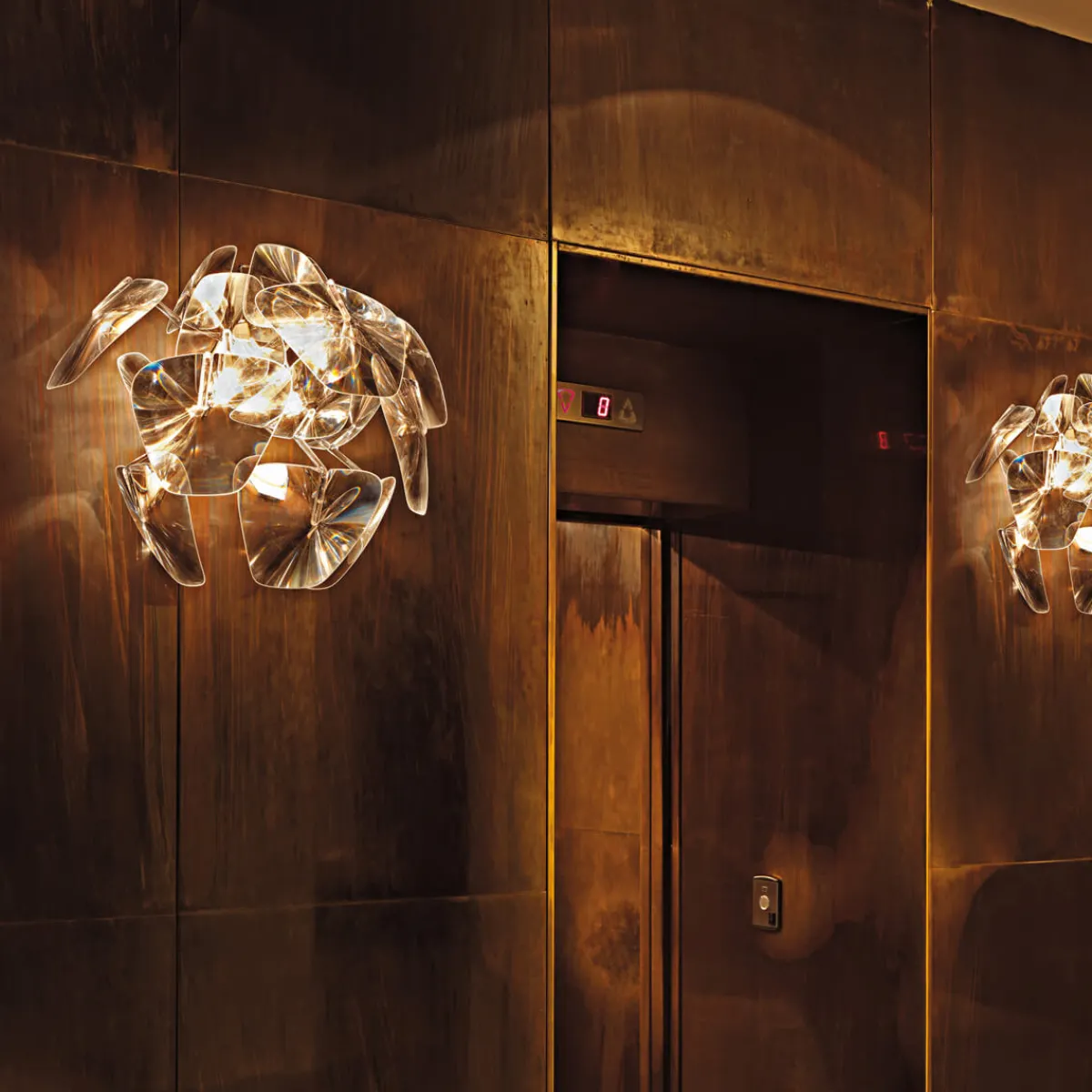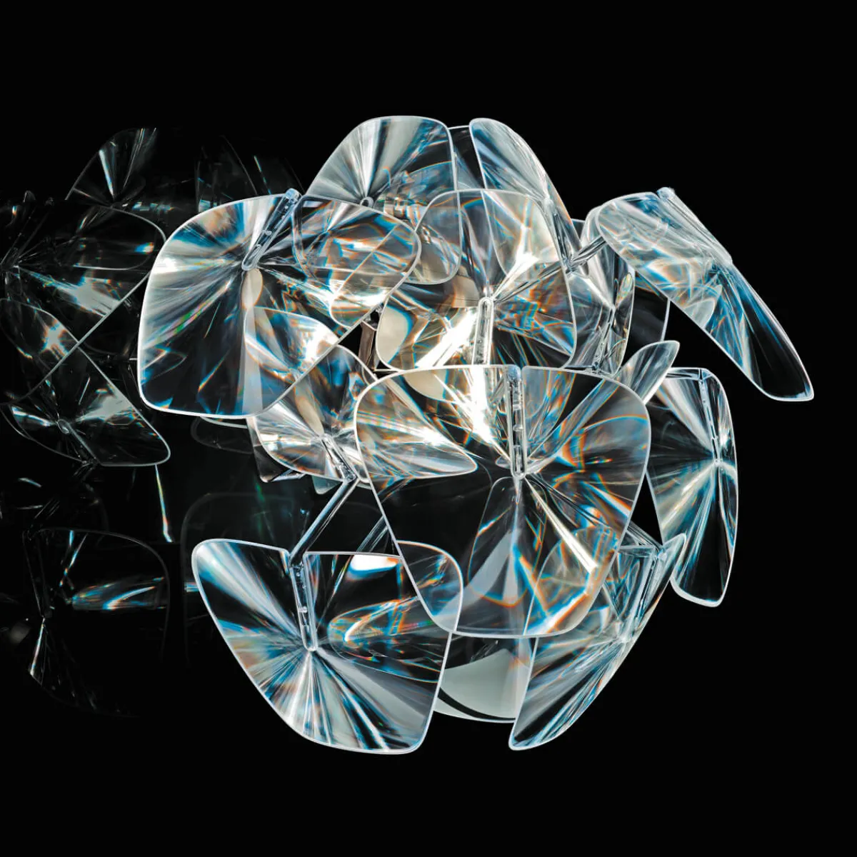 Ihre glanzvolle Erscheinung verdankt die Luceplan Hope Parete ihrem kunstvoll gestalteten Leuchtenschirm. Dieser ist aus einer Vielzahl dünner Kunststoff-Fresnel-Linsen gebildet, die das wie die schützenden Blätter einer Knospe umgeben. Sie erzeugen einen dioptrischen Effekt ähnlich wie Glas und reflektieren das Licht auf vielfache Weise.
