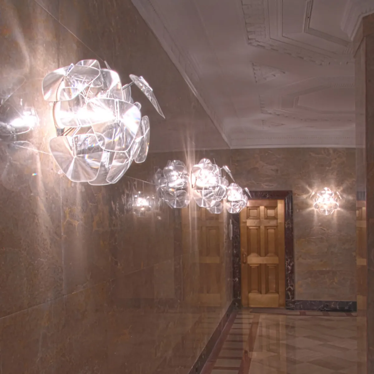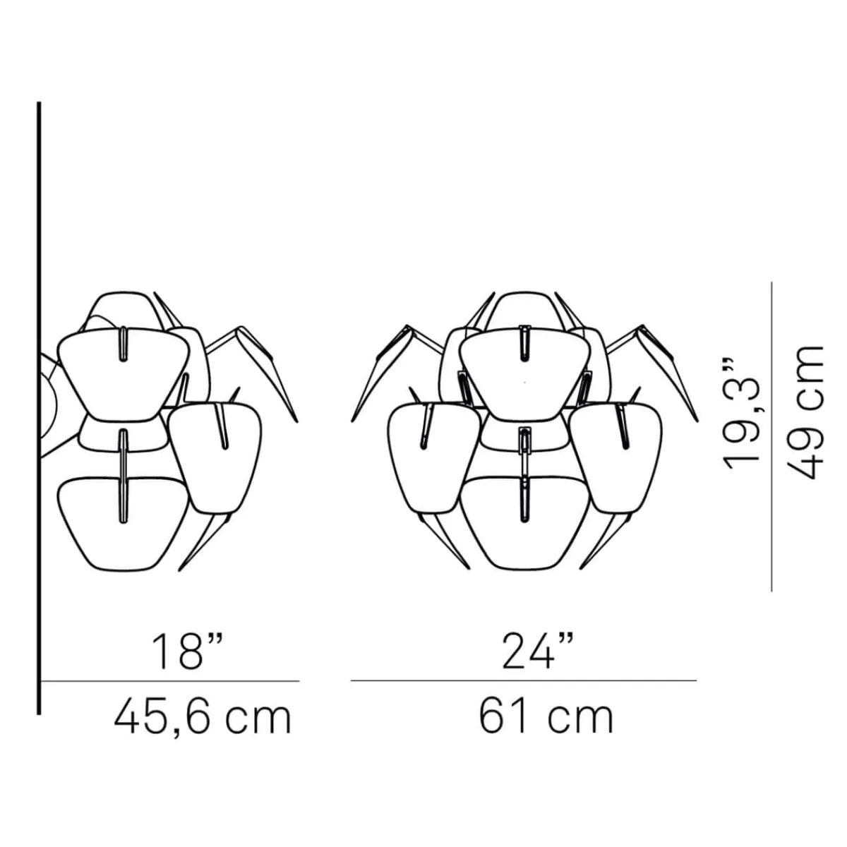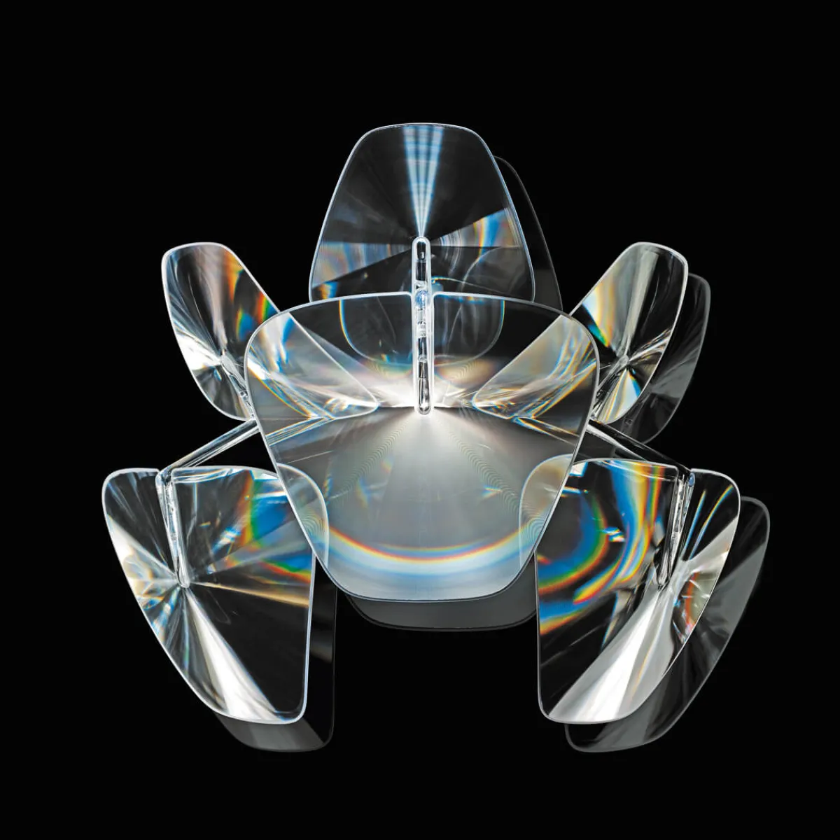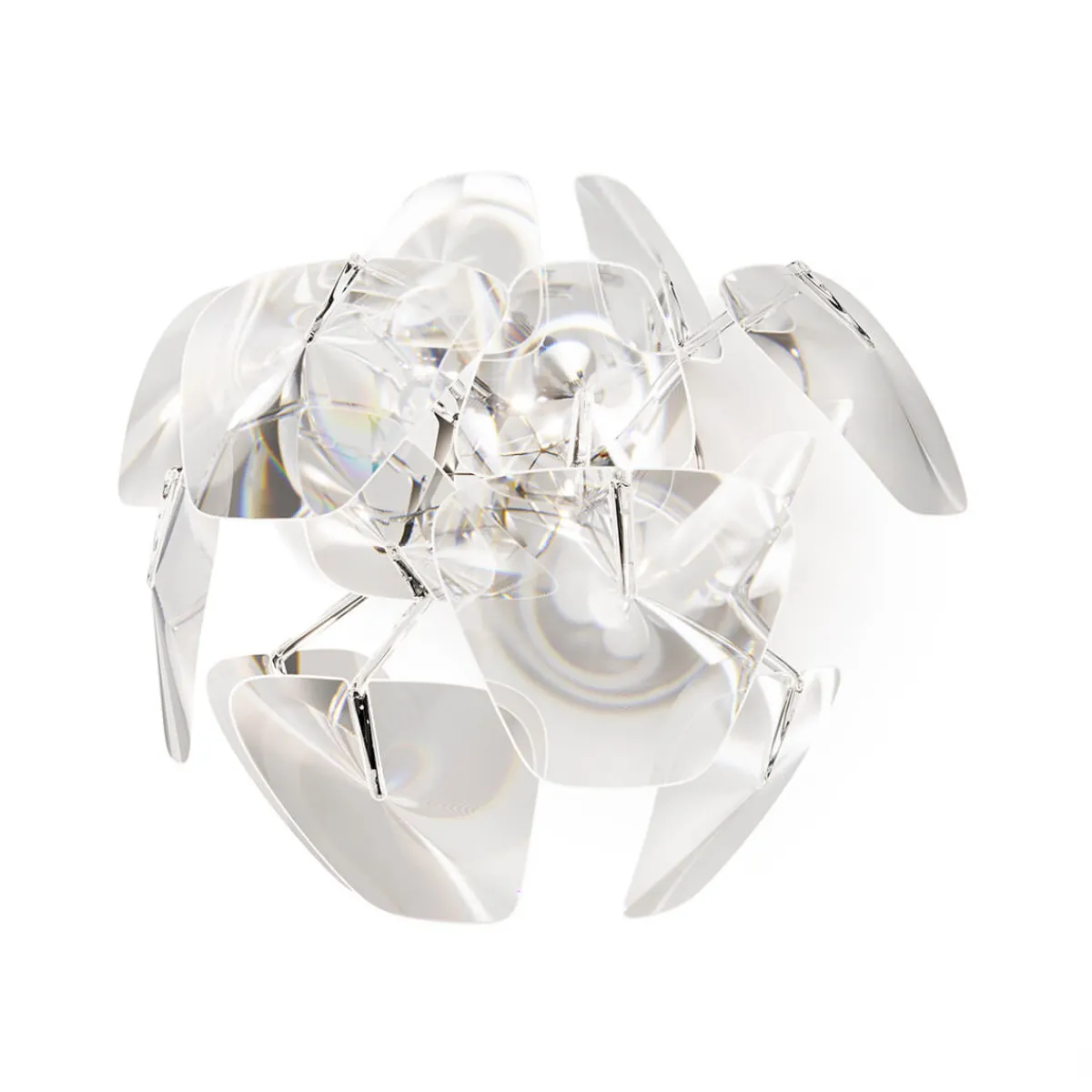 Ihre glanzvolle Erscheinung verdankt die Luceplan Hope Parete ihrem kunstvoll gestalteten Leuchtenschirm. Dieser ist aus einer Vielzahl dünner Kunststoff-Fresnel-Linsen gebildet, die das wie die schützenden Blätter einer Knospe umgeben. Sie erzeugen einen dioptrischen Effekt ähnlich wie Glas und reflektieren das Licht auf vielfache Weise.