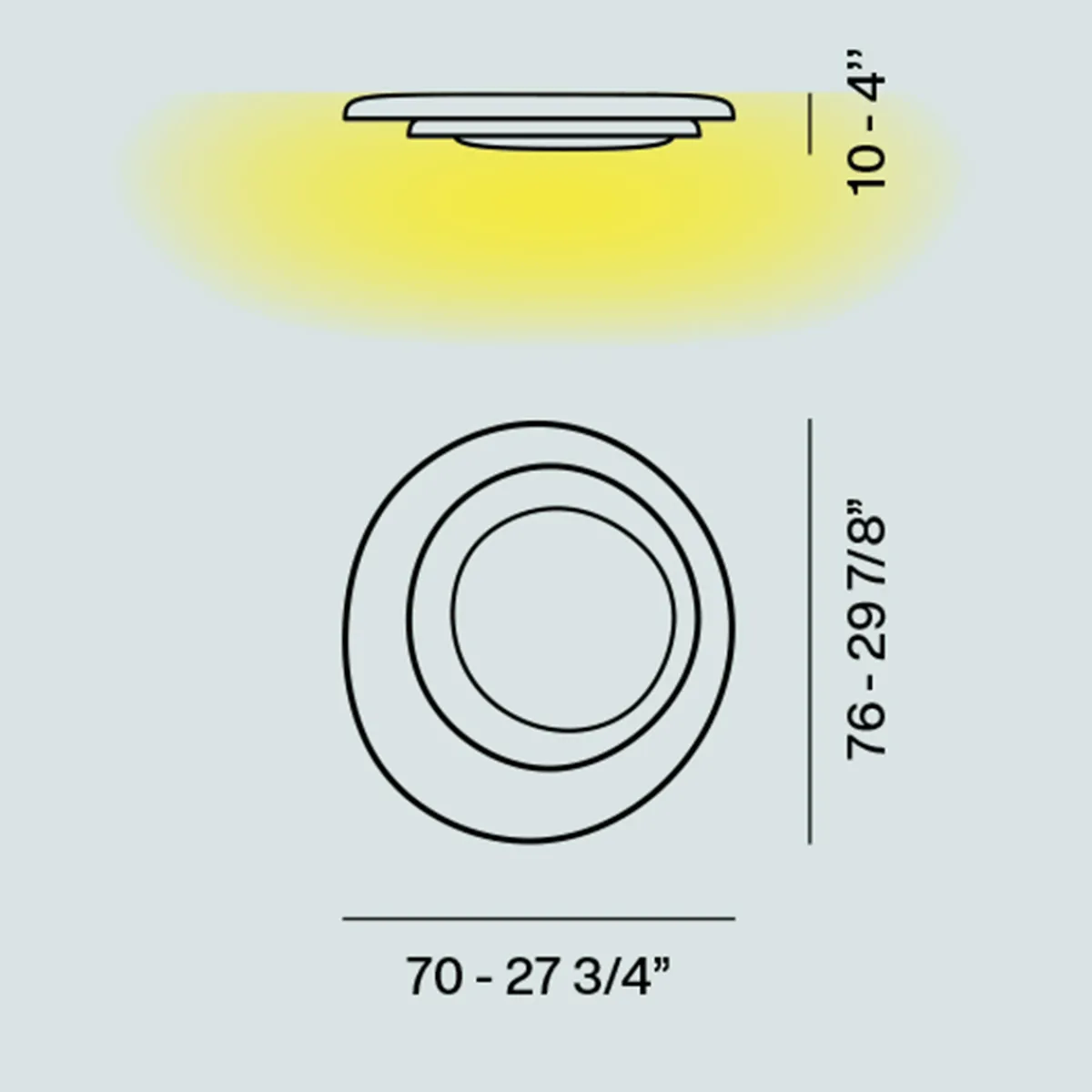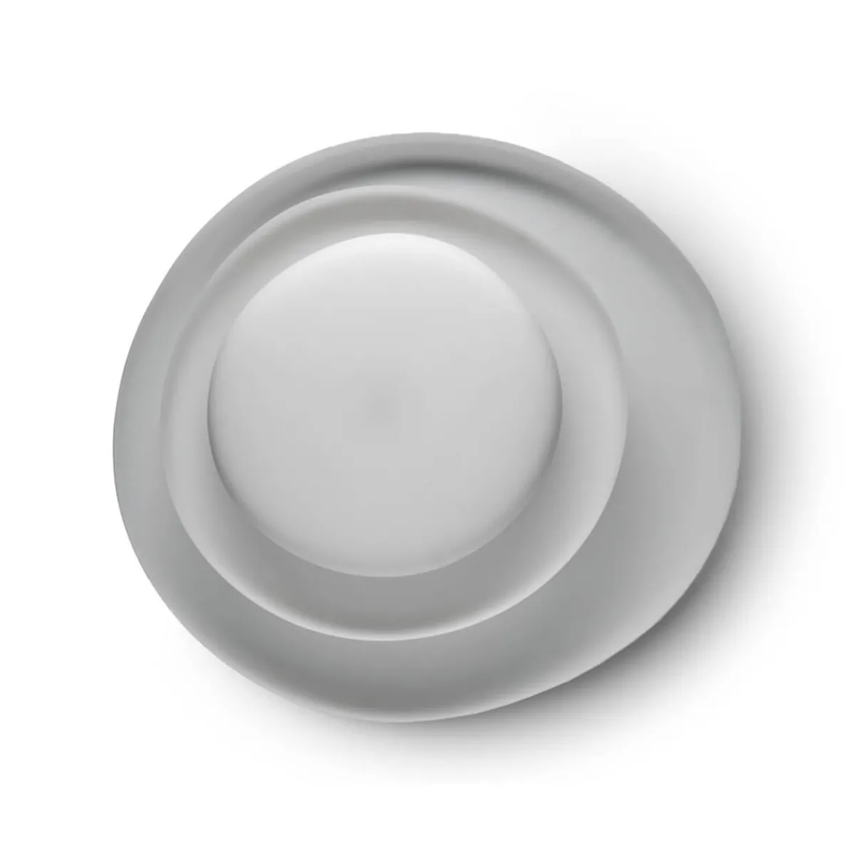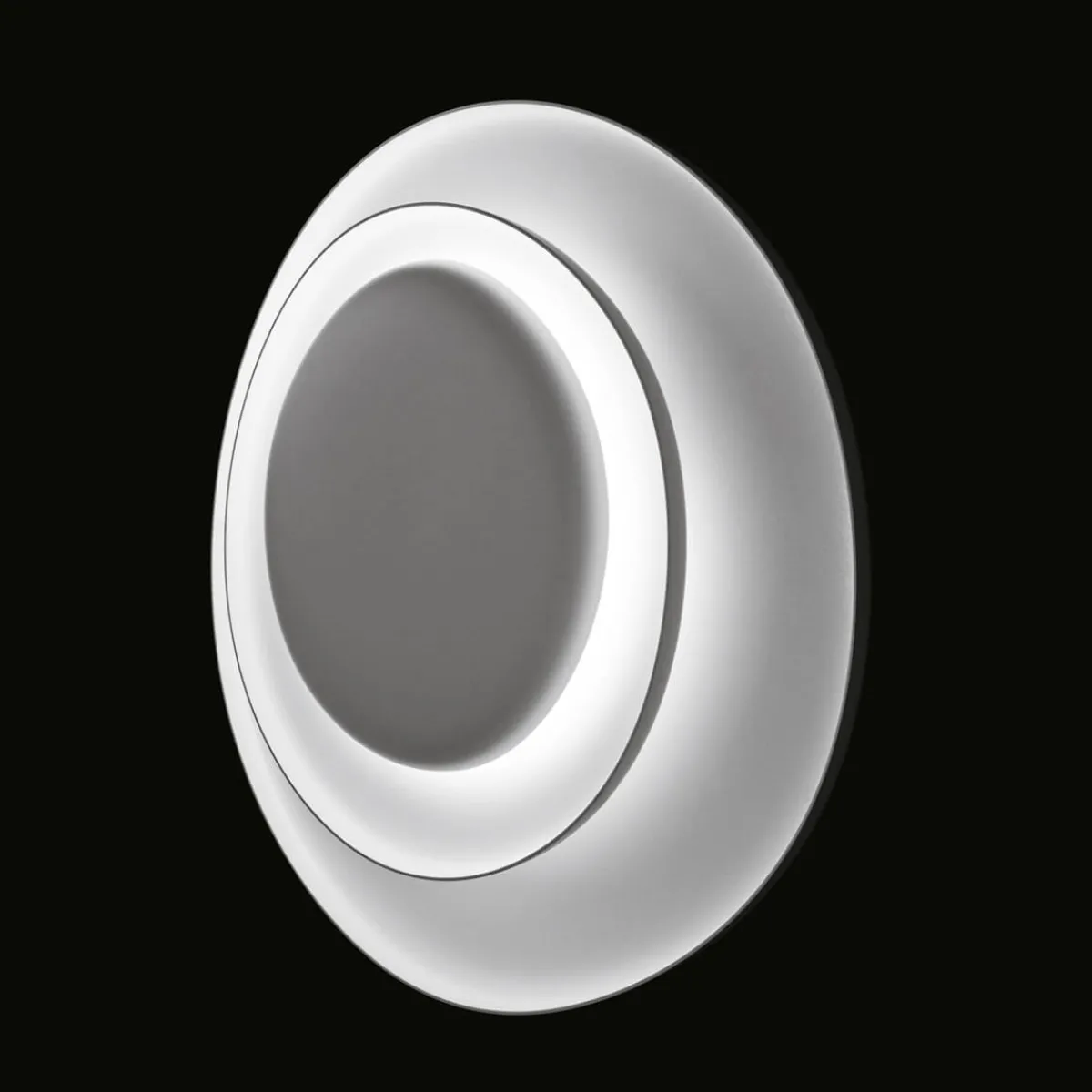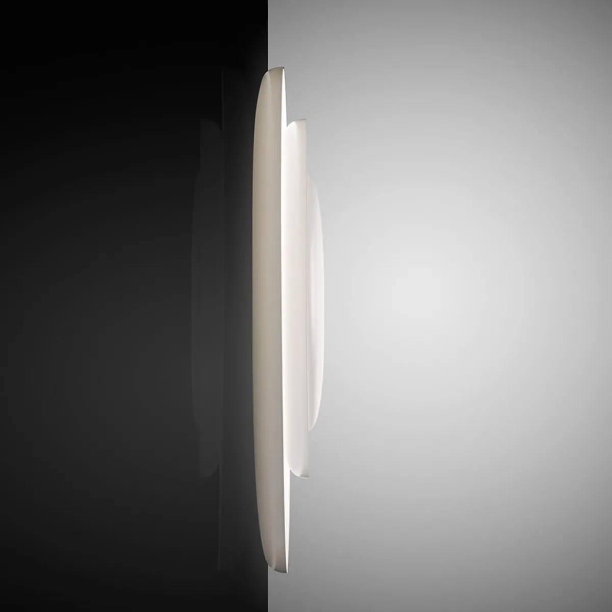 Der Korpus der Foscarini Bahia besteht aus kreisrunden Scheiben aus mattweißem Polycarbonat, die in ihrem Durchmesser variieren und einen reizvollen visuellen Echoeffekt erzeugen – ähnlich dem Bild einer konzentrisch ausstrahlenden Kugelwelle. Das Licht der integrierten LED- erstrahlt indirekt und kreiert ein attraktives Licht- und Schattenspiel.