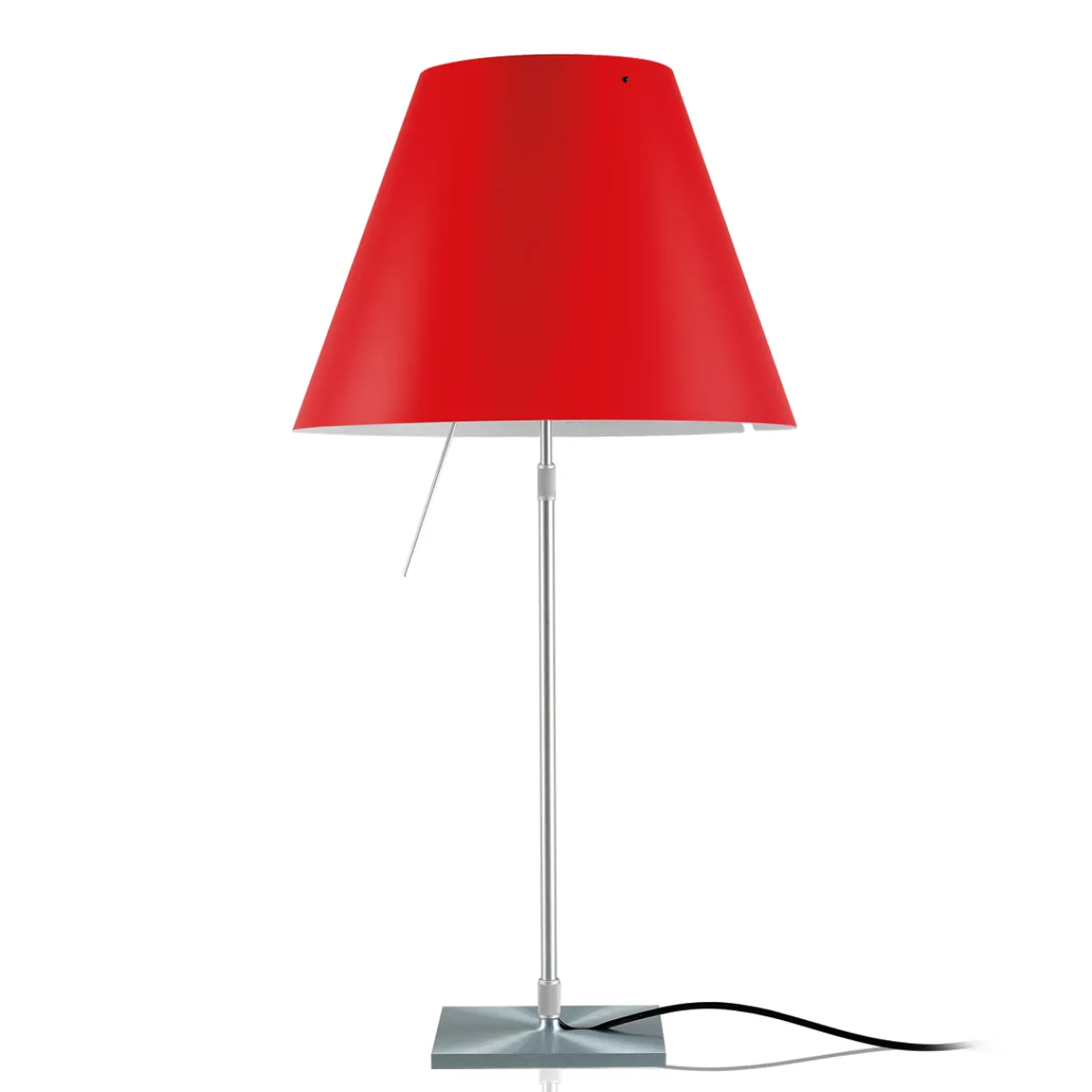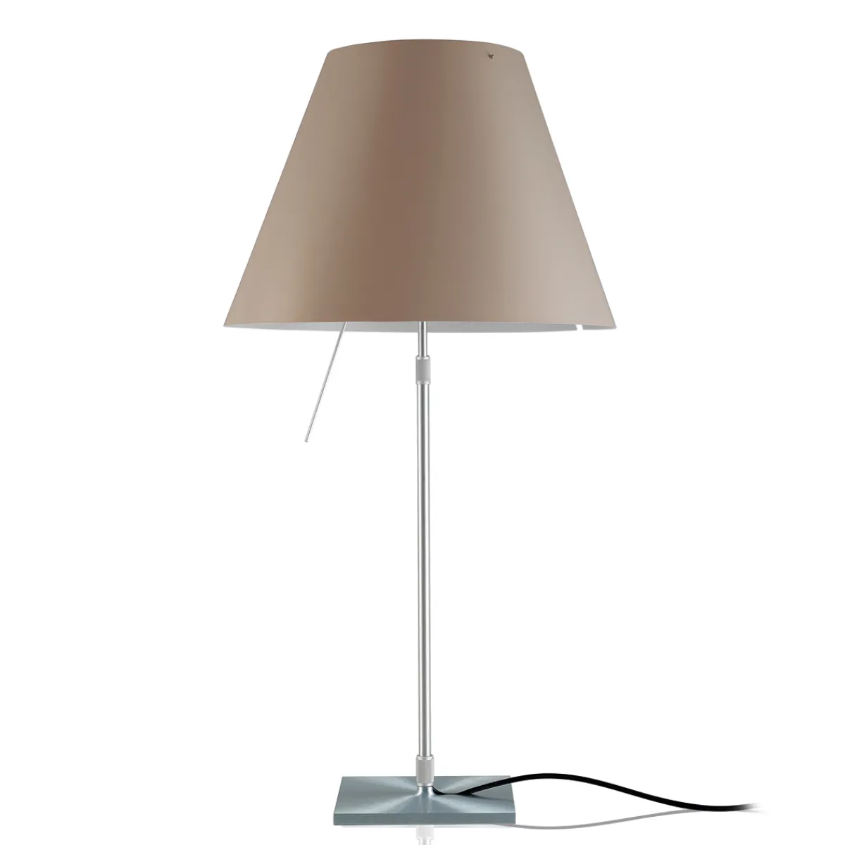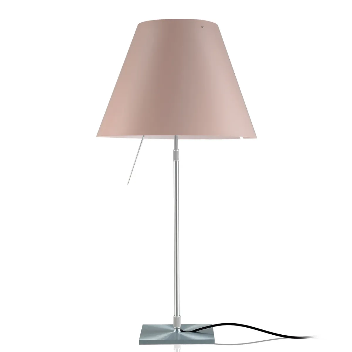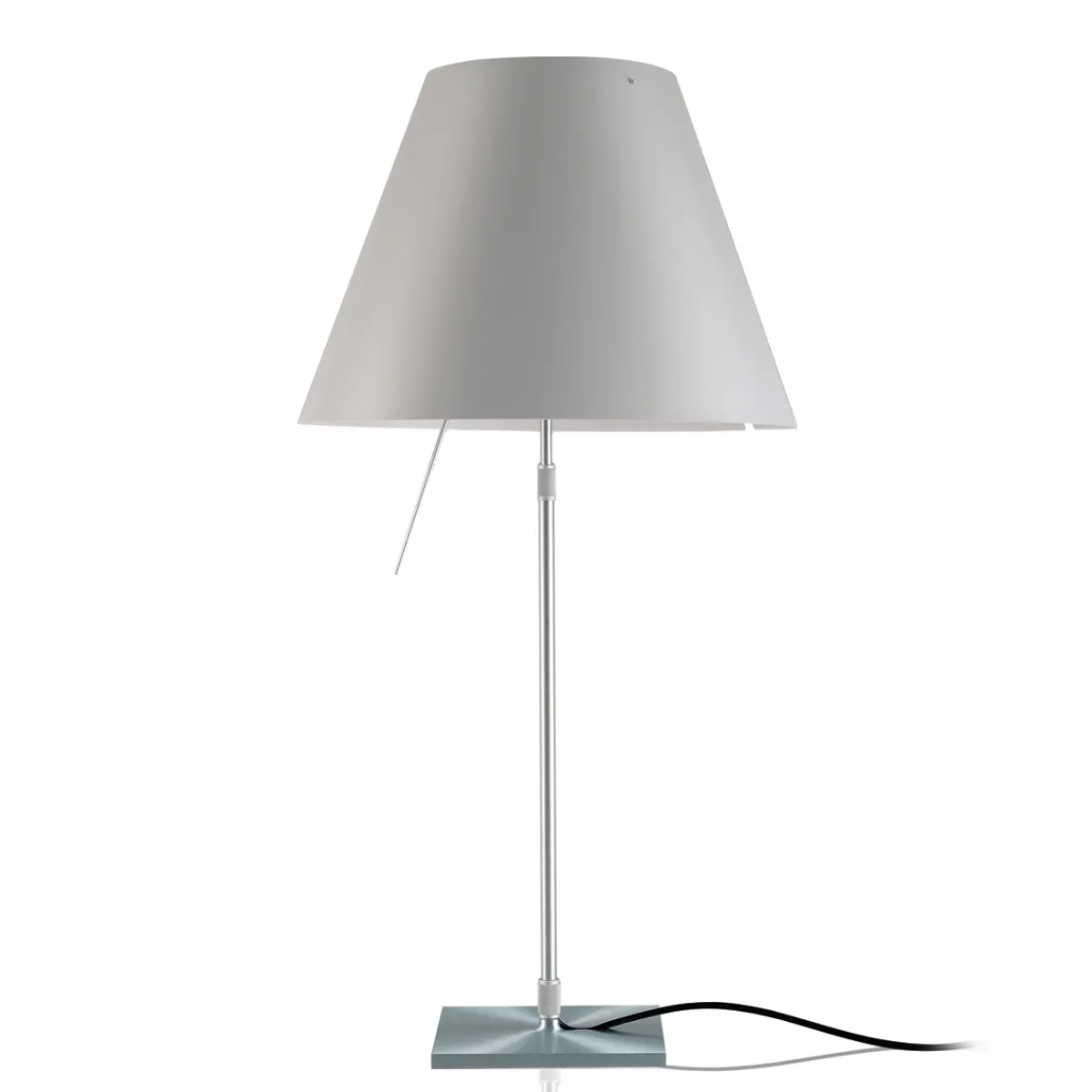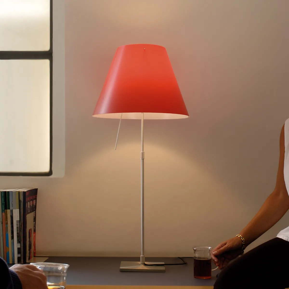 Kennzeichnendes Element der Luceplan Costanza Leuchtenserie ist der konisch geformte Schirm aus siebbedrucktem Polycarbonat. Er ist auswechselbar, von geringem Gewicht und einfach zu reinigen. Getragen wird er von lediglich zwei Haltepunkten, sodass er, wenn er angestoßen wird, sanft hin- und herschaukelt, um sich auszubalancieren. Der Fuß der Costanza Tavolo Tischleuchte ist aus Aluminium gefertigt.