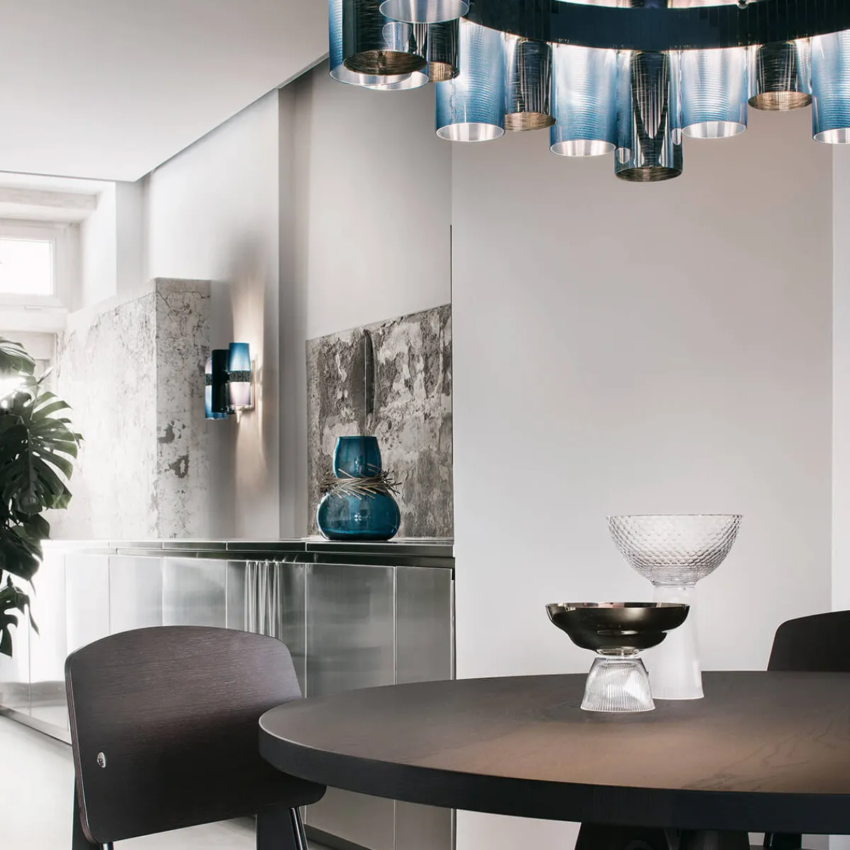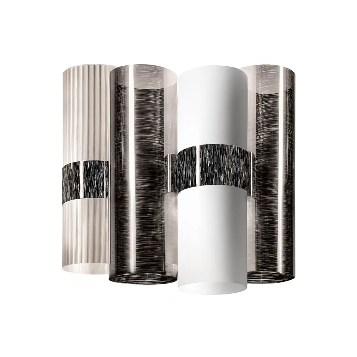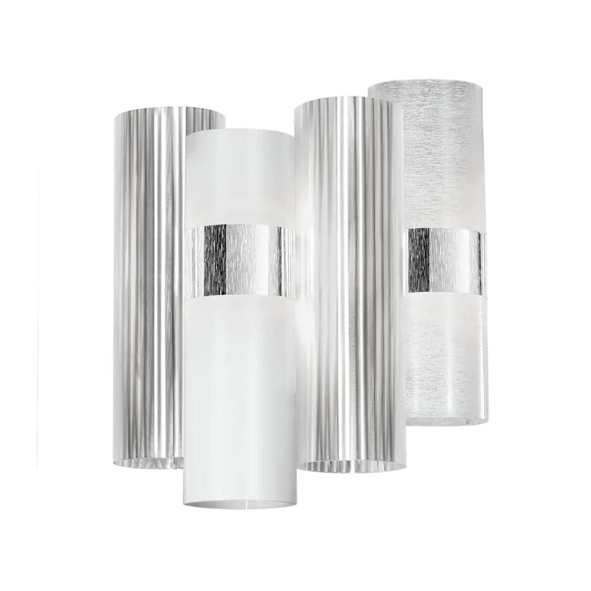Der Leuchtenkörper besteht aus nebeneinander angeordneten Zylindern aus Opalflex® und Lentiflex®, zwei von Slamp patentierten, aufwendig veredelten Technopolymeren. Die Zylinder sind mit hochwertigen Gradienten-Finishes, Metallisierungen und Folien mit gebürsteten Oberflächen versehen, die zusammen eine vielfältig schimmernde Wirkung kreieren und eine brillante, einzigartige Ästhetik schaffen.
