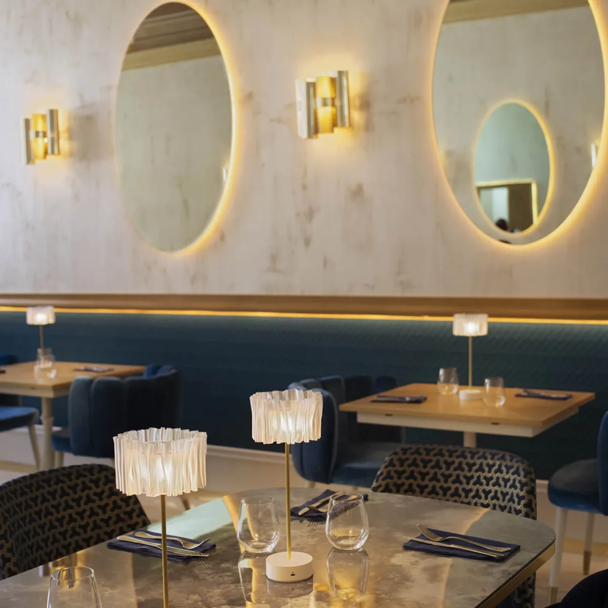 Die Akzentleuchte zeichnet sich durch eine Kombination aus direkter und indirekter, diffuser Lichtausstrahlung aus, die ein zauberhaftes Akzentlicht schafft. Dies macht sie zur perfekten Wahl für private Wohnzimmer und Flure. Aber auch in öffentlichen Innenräumen wie Salons, Lounges und Hotellobbys entfaltet sie ihre stilvolle, spektakuläre Wirkung.