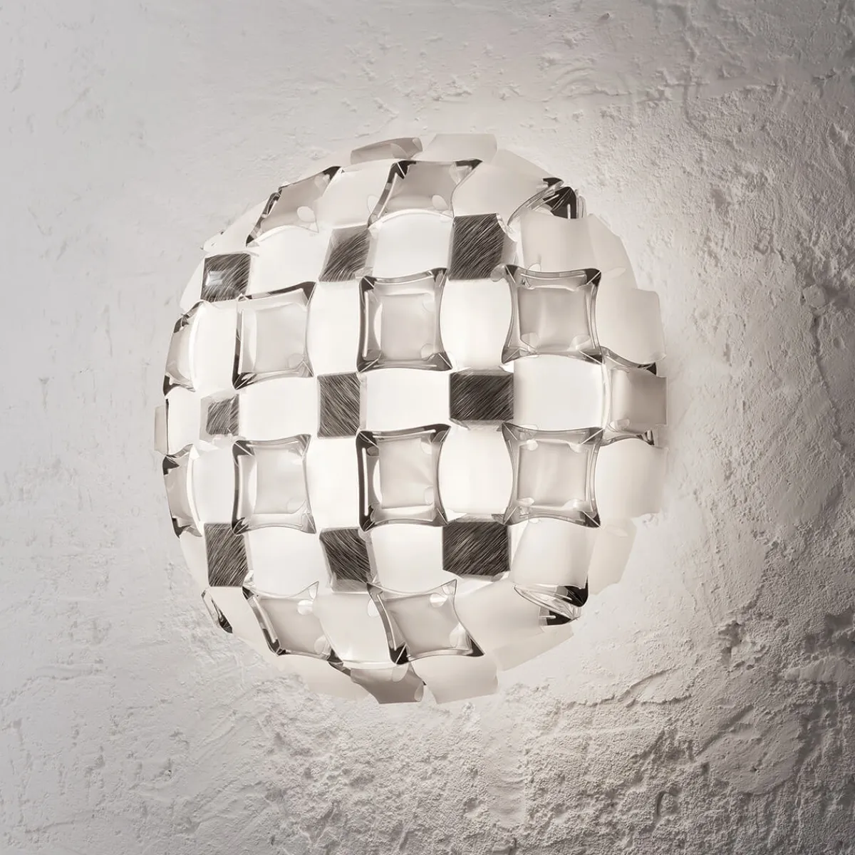 Durch ihre Größe eignet sich die Mida Ceiling / Wall Large besonders gut für öffentliche Innenräume wie Hotellobbys und Lounges, aber auch für großzügige Wohnräume und Flure. Die spendet ein indirektes und diffuses Licht, das durch einen Pavé aus „Edelsteinen“ aus Slamps patentierten Kunststoffen Lentiflex® und Opalflex® erzeugt wird. Diese Materialien brechen das Licht in einer Weise, die seine Umgebung sanft und einladend erleuchtet und gleichzeitig funkelnde Akzente setzt.