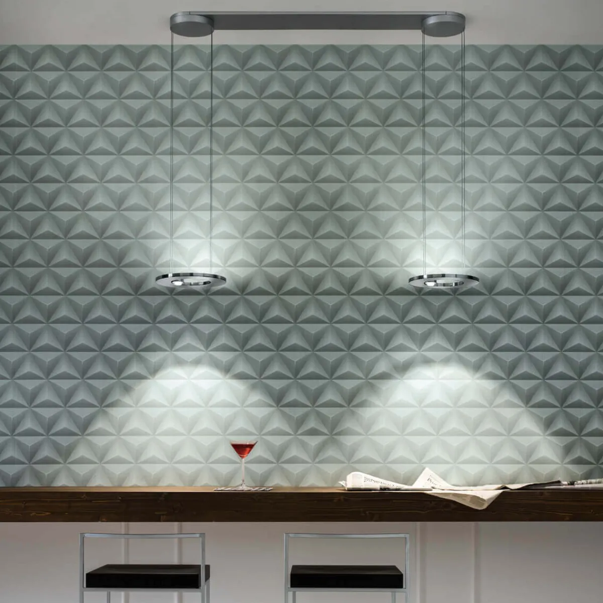 Die Cini & Nils Passepartout25 / Sferico Rosone 90 dient als Zubehör für die Passepartout25 sopratavolo LED und Sferico LED Sospeso Pendelleuchten. Es handelt sich um einen Baldachin, der es ermöglicht, mehrere Leuchten in Serie zu schalten und von einem einzigen Lichtpunkt aus zu betreiben. Die einzelnen Pendel werden durch den Baldachin in einem Abstand von circa 90 cm aufgehängt.