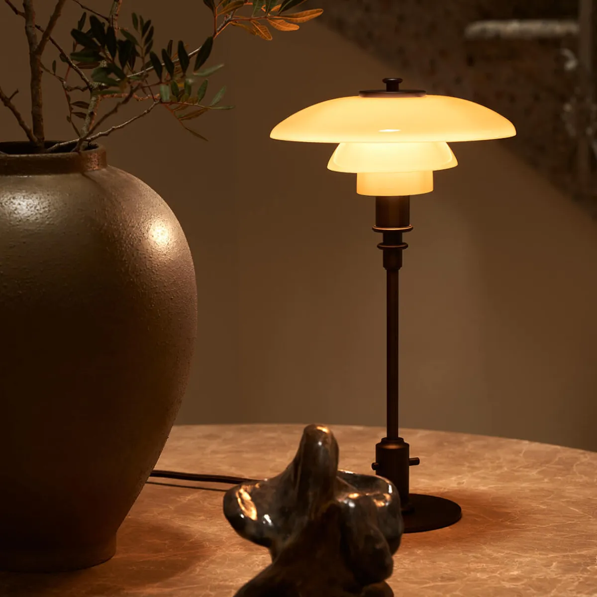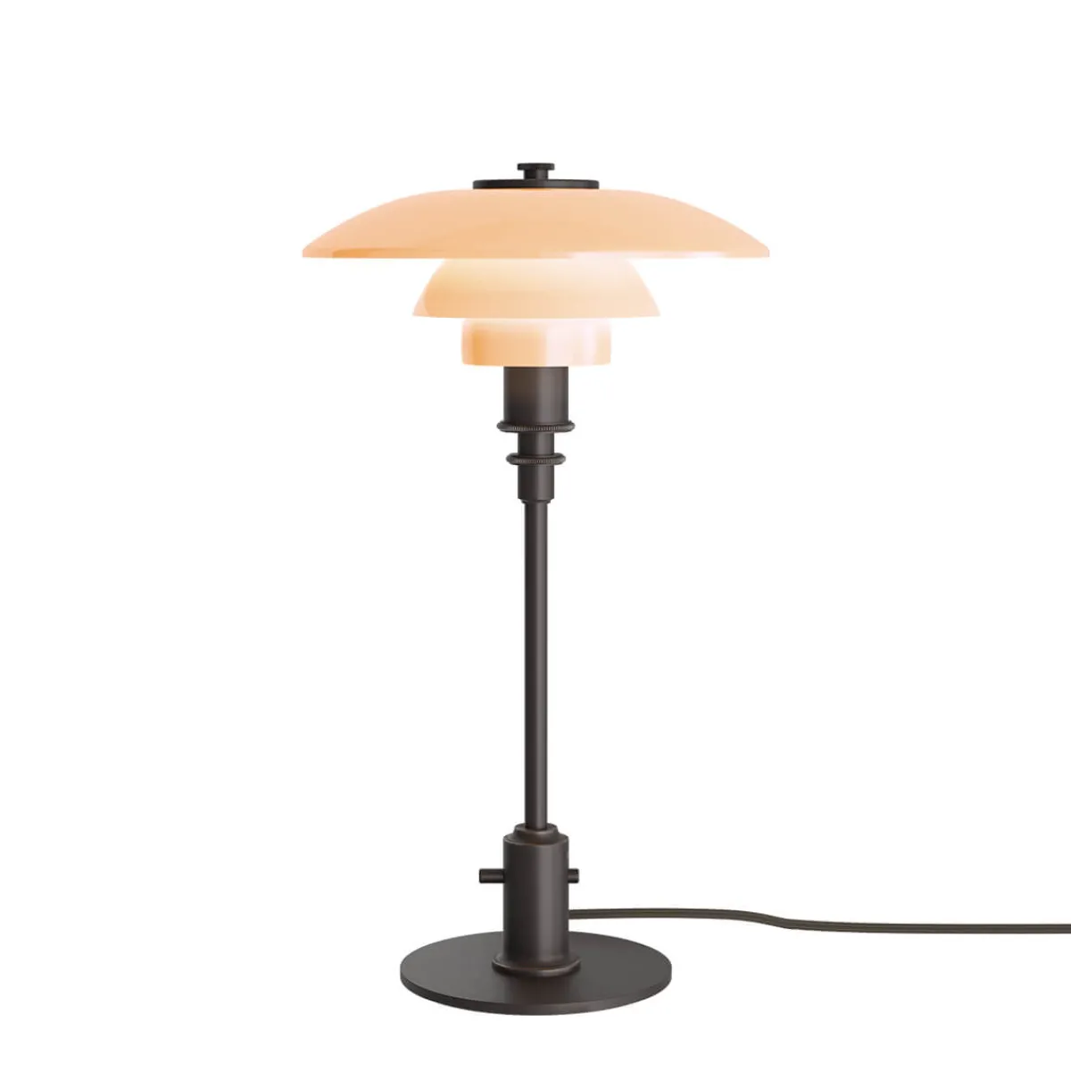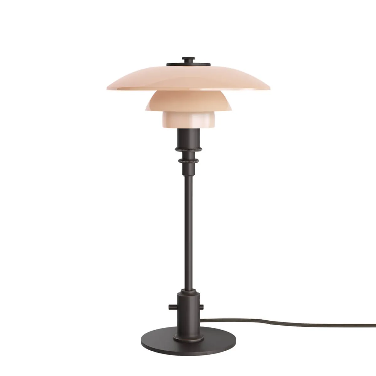 Henningsens revolutionäres Dreischirmsystem – die Grundlage aller PH Lampen – findet sich auch bei der PH 2/1 Tischlampe, um ein angenehm weiches, nach unten gerichtetes Licht zu erzeugen. Die zeichnet sich durch drei vierschichtige, mundgeblasene Opalglasschirme aus, die in einem warmen Dusty-Terracotta-Ton gehalten sind. Die Oberseiten sind glänzend ausgeführt, die Unterseiten sandgestrahlt und mit einer matt opalweißen Schicht versehen, um eine poetische Lichtstimmung zu kreieren. Das Ergebnis ist ein gleichmäßiger, blendfreier Lichtschein, der jede Umgebung verzaubert.
