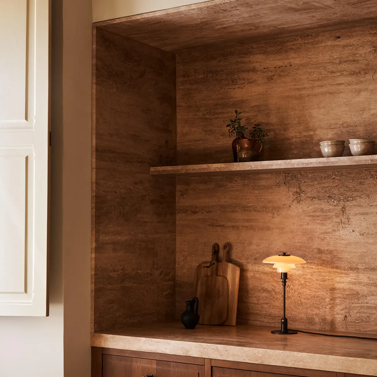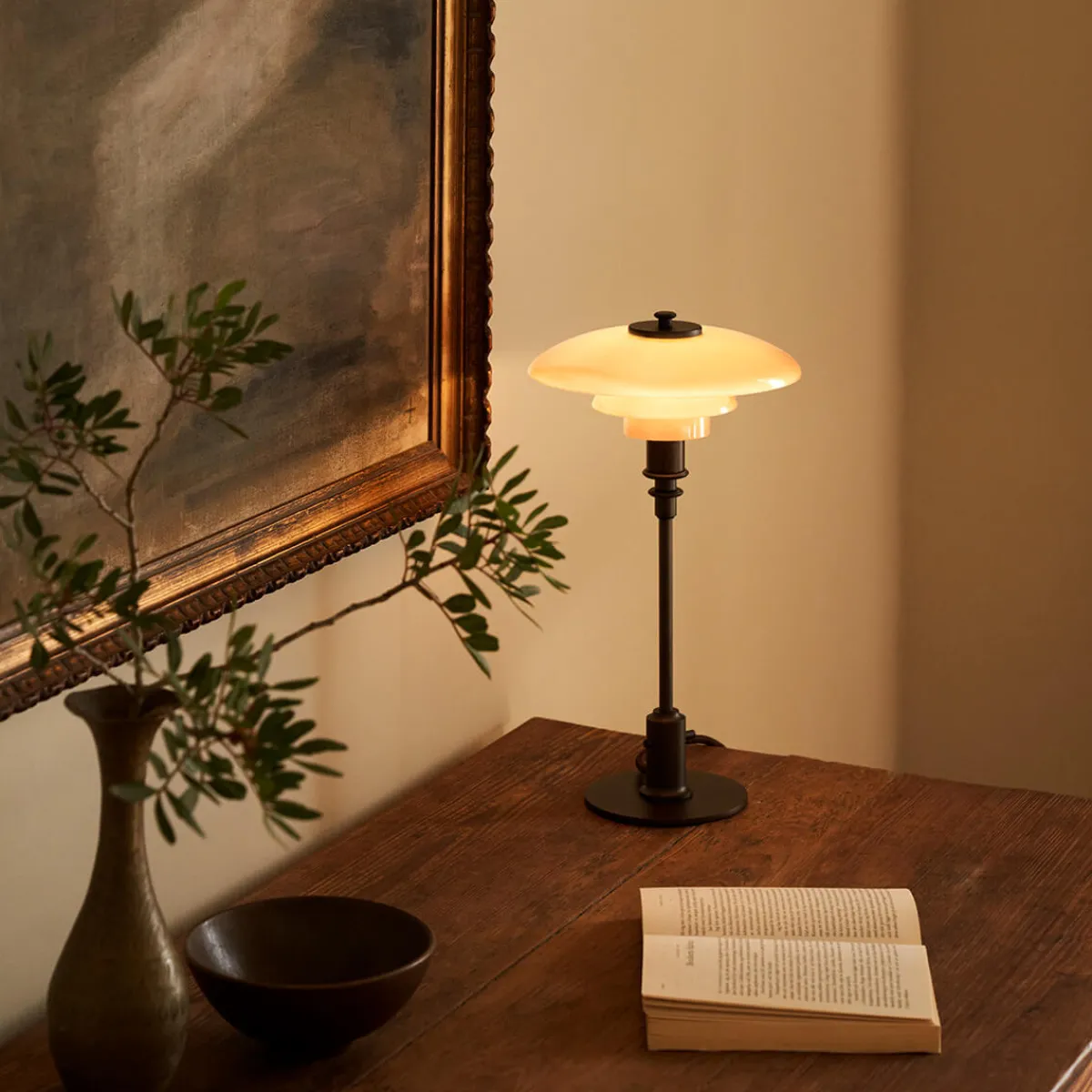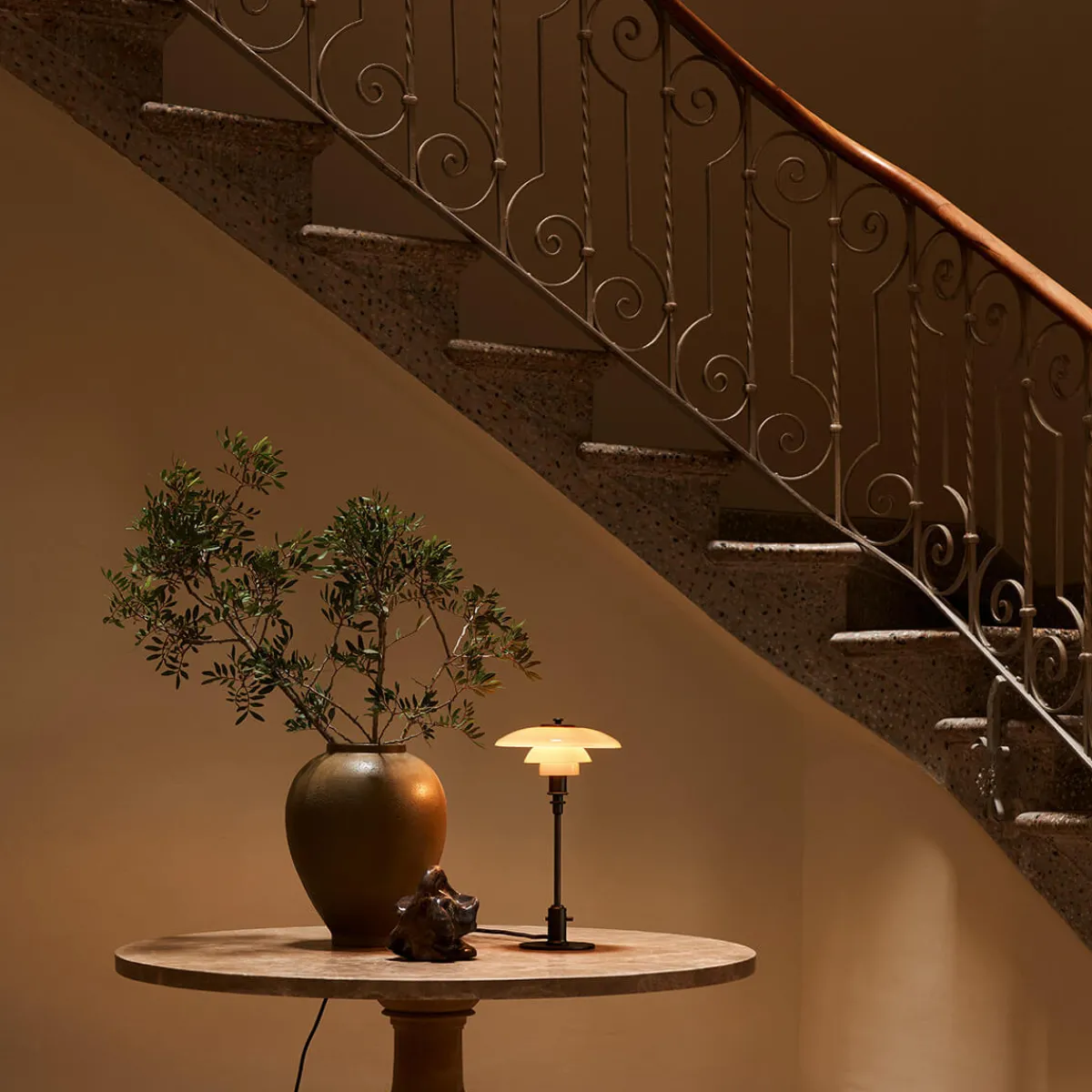 Henningsens revolutionäres Dreischirmsystem – die Grundlage aller PH Lampen – findet sich auch bei der PH 2/1 Tischlampe, um ein angenehm weiches, nach unten gerichtetes Licht zu erzeugen. Die zeichnet sich durch drei vierschichtige, mundgeblasene Opalglasschirme aus, die in einem warmen Dusty-Terracotta-Ton gehalten sind. Die Oberseiten sind glänzend ausgeführt, die Unterseiten sandgestrahlt und mit einer matt opalweißen Schicht versehen, um eine poetische Lichtstimmung zu kreieren. Das Ergebnis ist ein gleichmäßiger, blendfreier Lichtschein, der jede Umgebung verzaubert.
