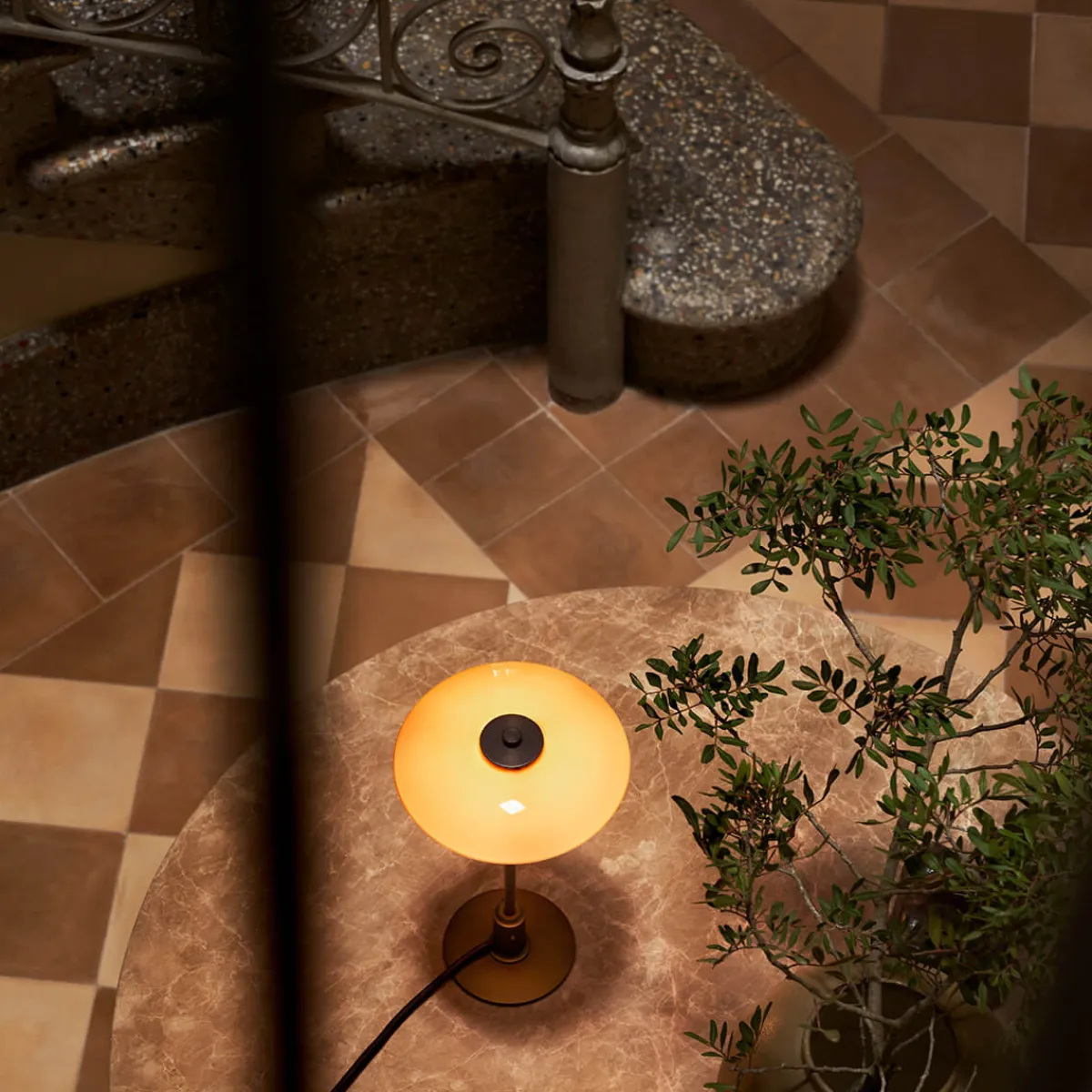 Der Fuß aus Altmessing, gebürstet mit feinen Haarlinien und schutzlackiert, verleiht der kleinen Tischleuchte von Louis Poulsen einen stilvollen Vintage-Look. Die Farbe harmoniert perfekt mit dem Terrakotta-Ton der Schirme und bleibt über Jahre hinweg schön. Komplettiert wird die durch eine elegante textilummantelte Zuleitung, die das Premium-Design vollendet.
