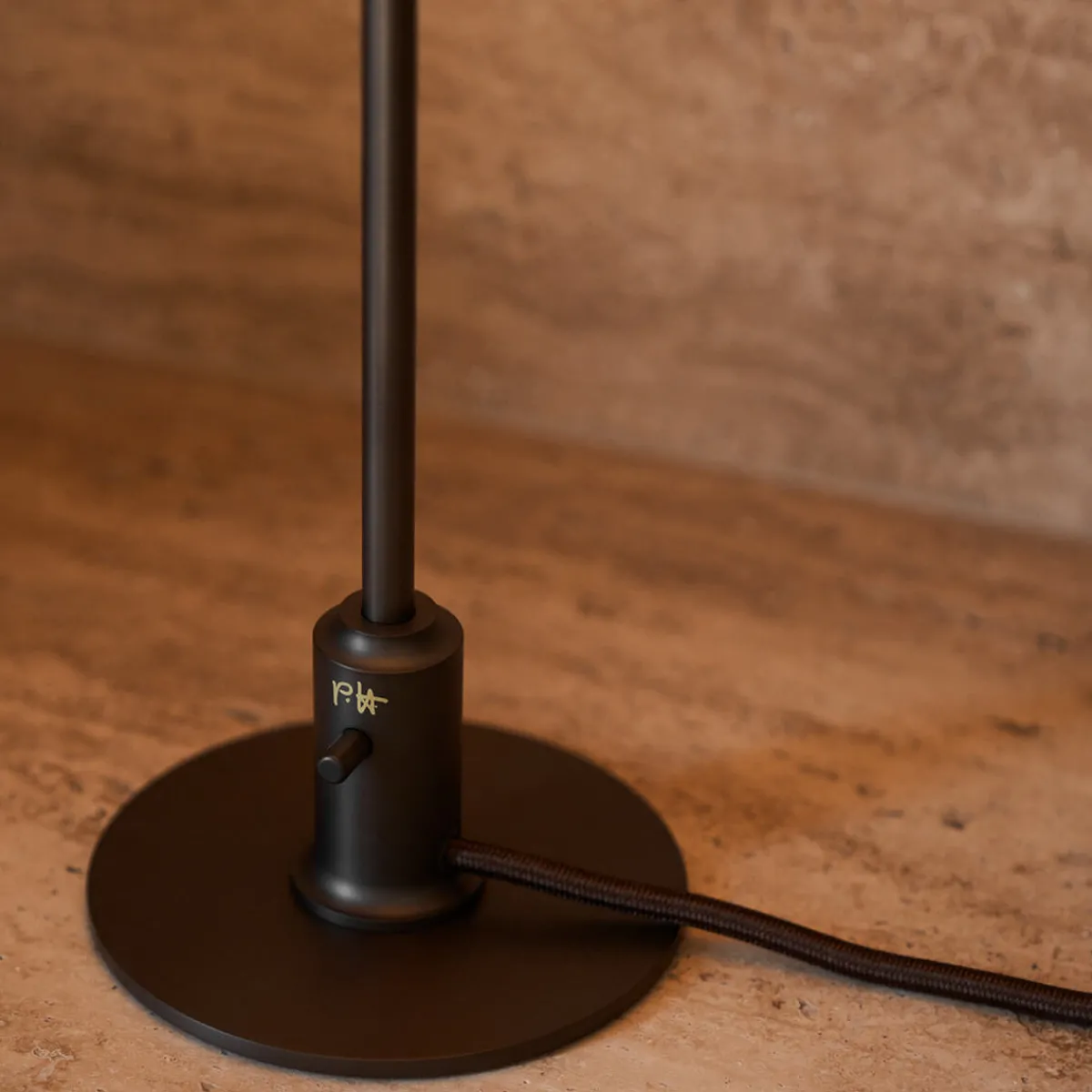 - Braunes Textilkabel und Messingschalter am Fuß