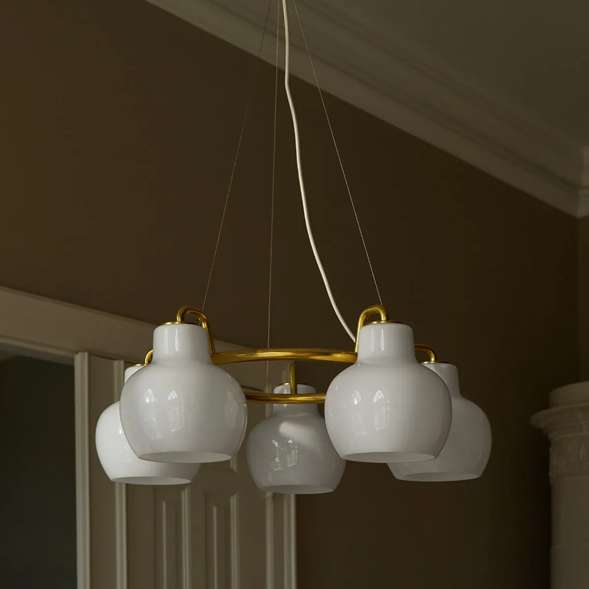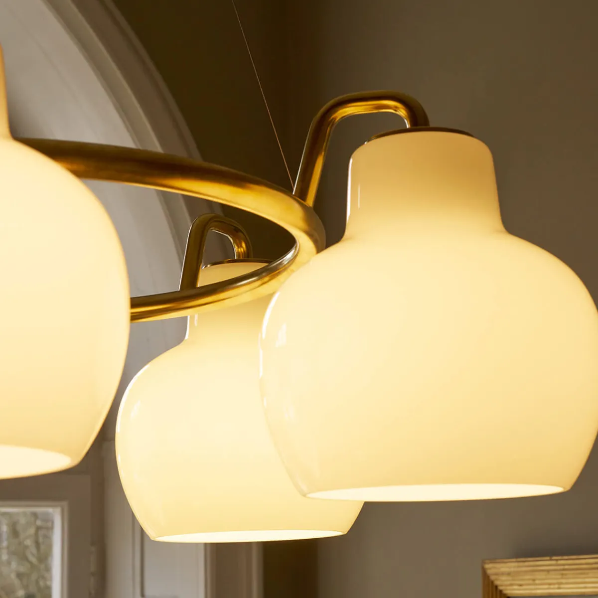 Die VL Ring Crown ist in Ausführungen mit drei, fünf oder sieben Schirmen erhältlich, die aus mundgeblasenem, dreischichtigem Opalglas gefertigt sind. Das hochwertige Glas sorgt für eine sanfte, diffuse und hüllt den Raum in eine warme, einladende Atmosphäre. Der Großteil des Lichts wird direkt nach unten abgegeben, wodurch die Pendellampe perfekt für Esstische, Wohnbereiche oder repräsentative Einrichtungskonzepte geeignet ist.