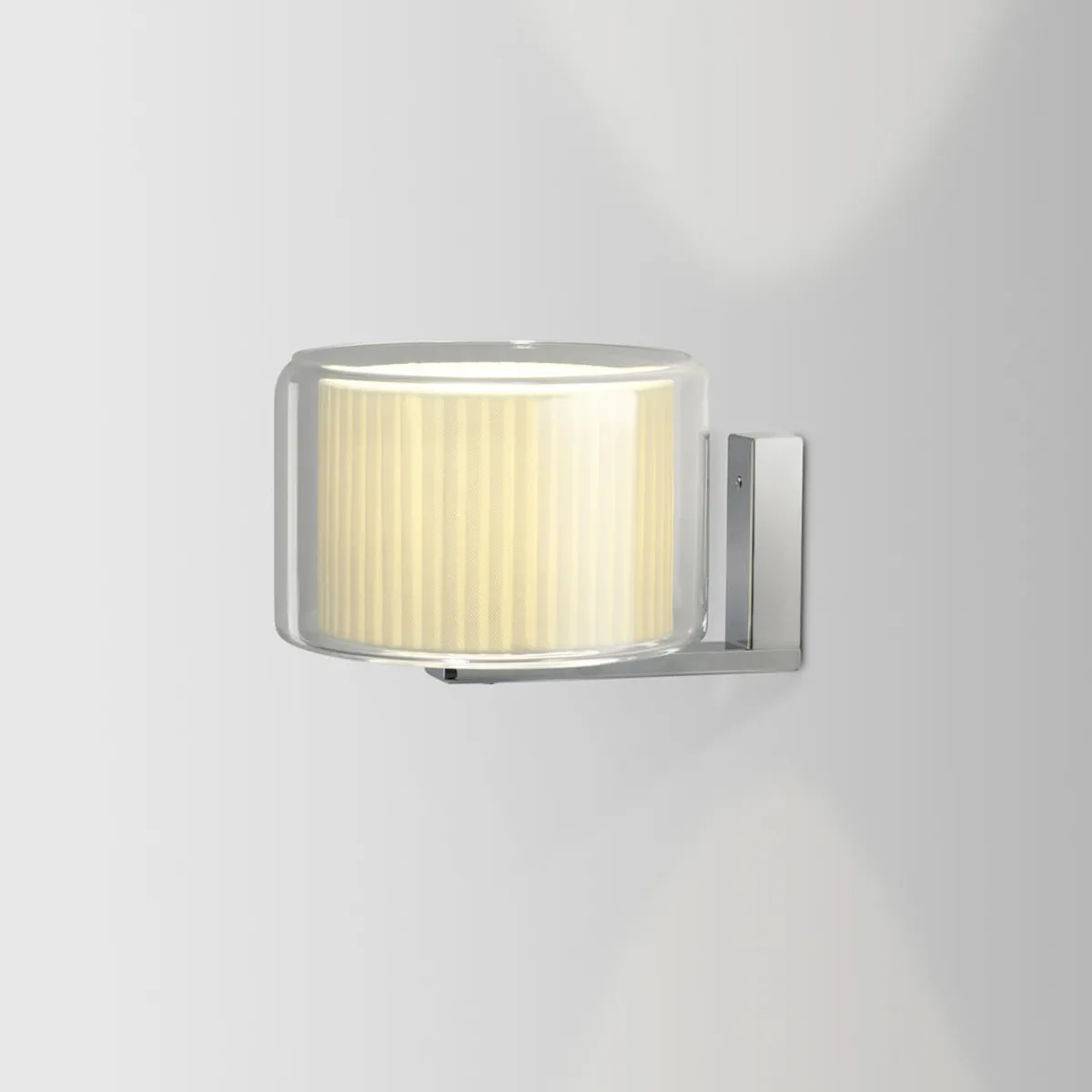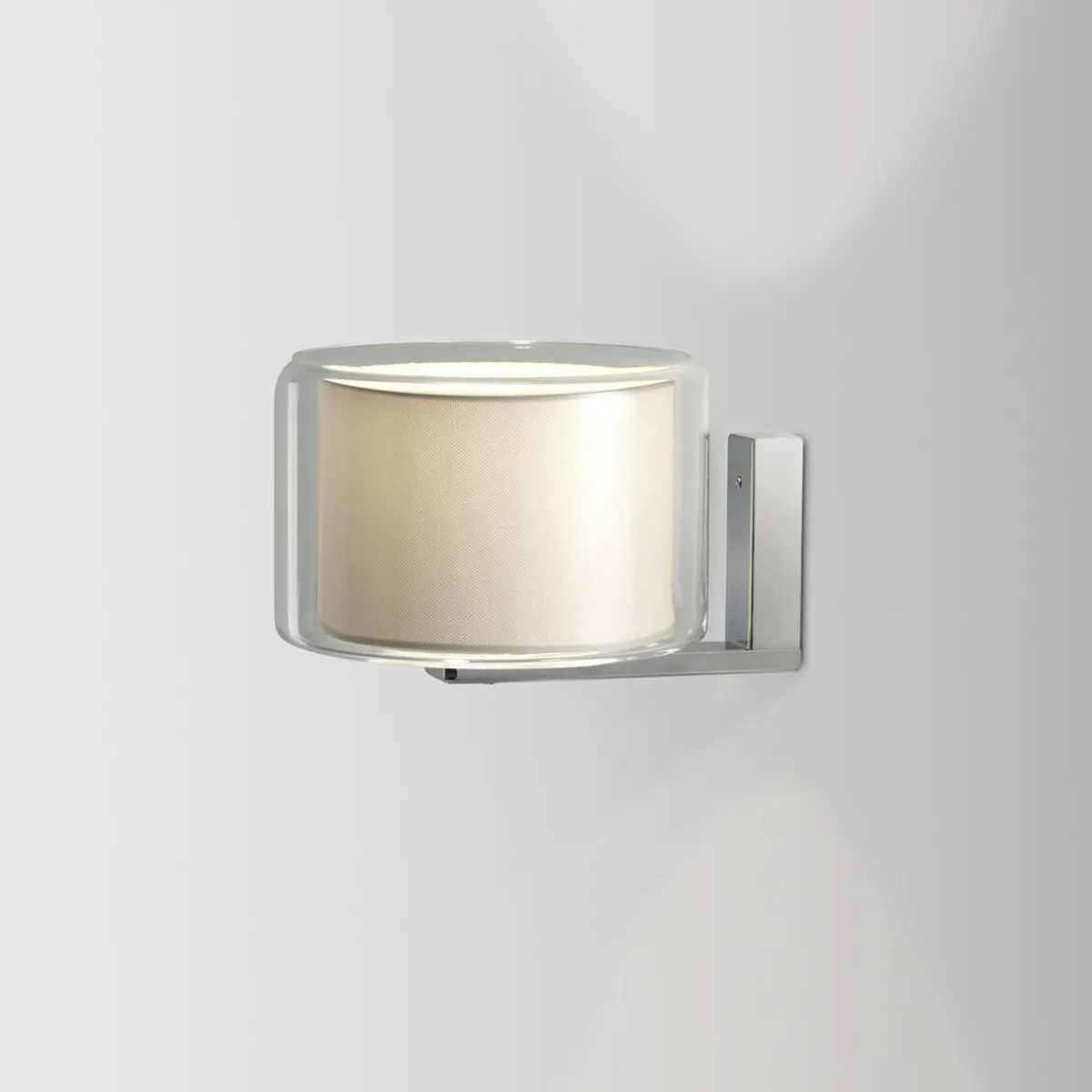 | Material/Oberfläche: | Wandhalterung: Eisen verchromt, Textilschirm, Außenschirm: geblasenes Glas transparent, Diffusorscheibe: opal |