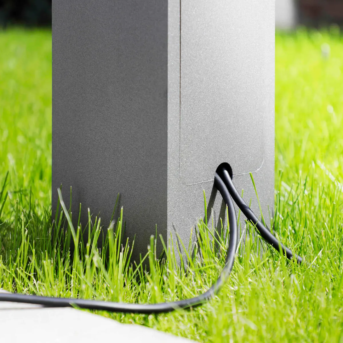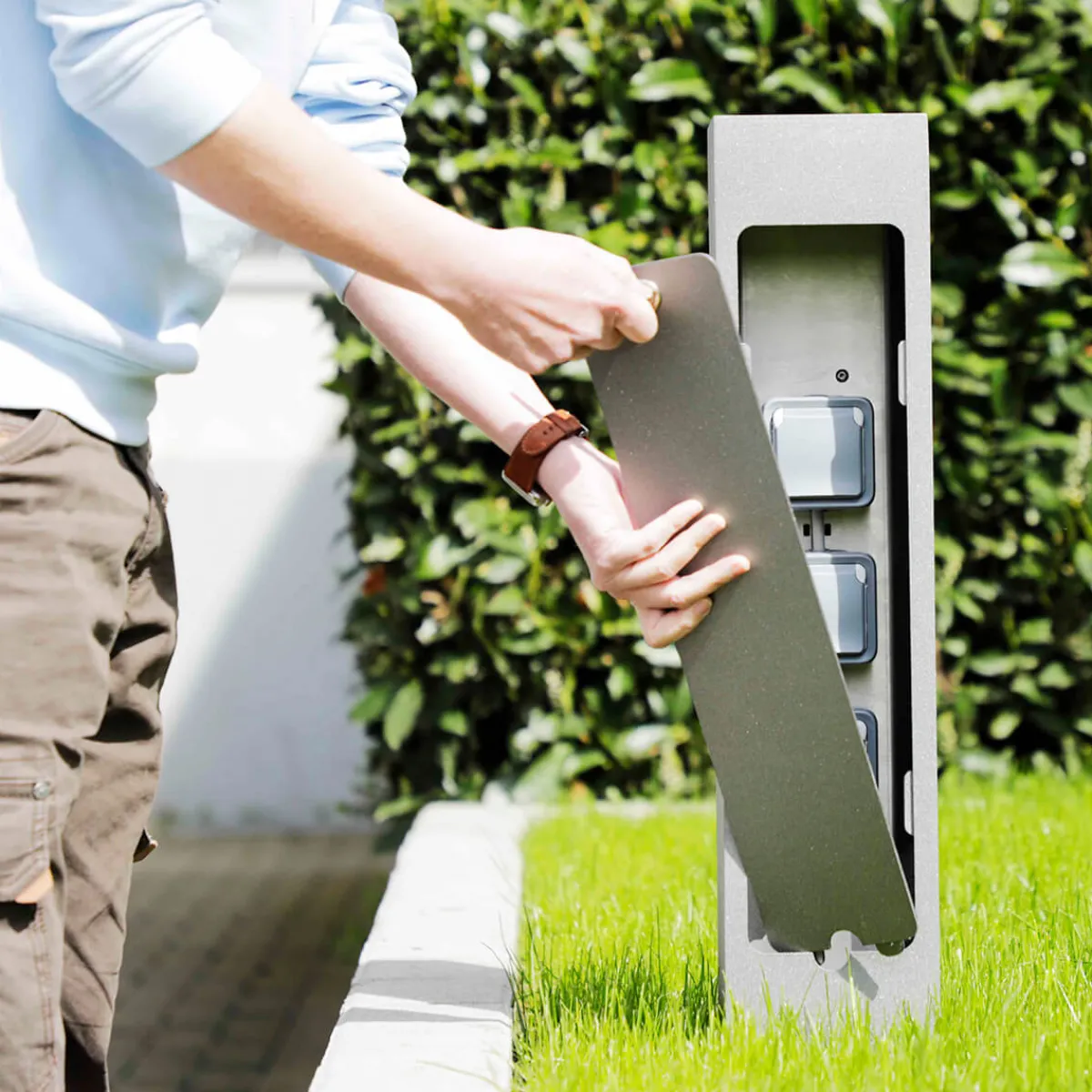 - Modern-schlichte Steckdosensäule mit abschließbarer Tür