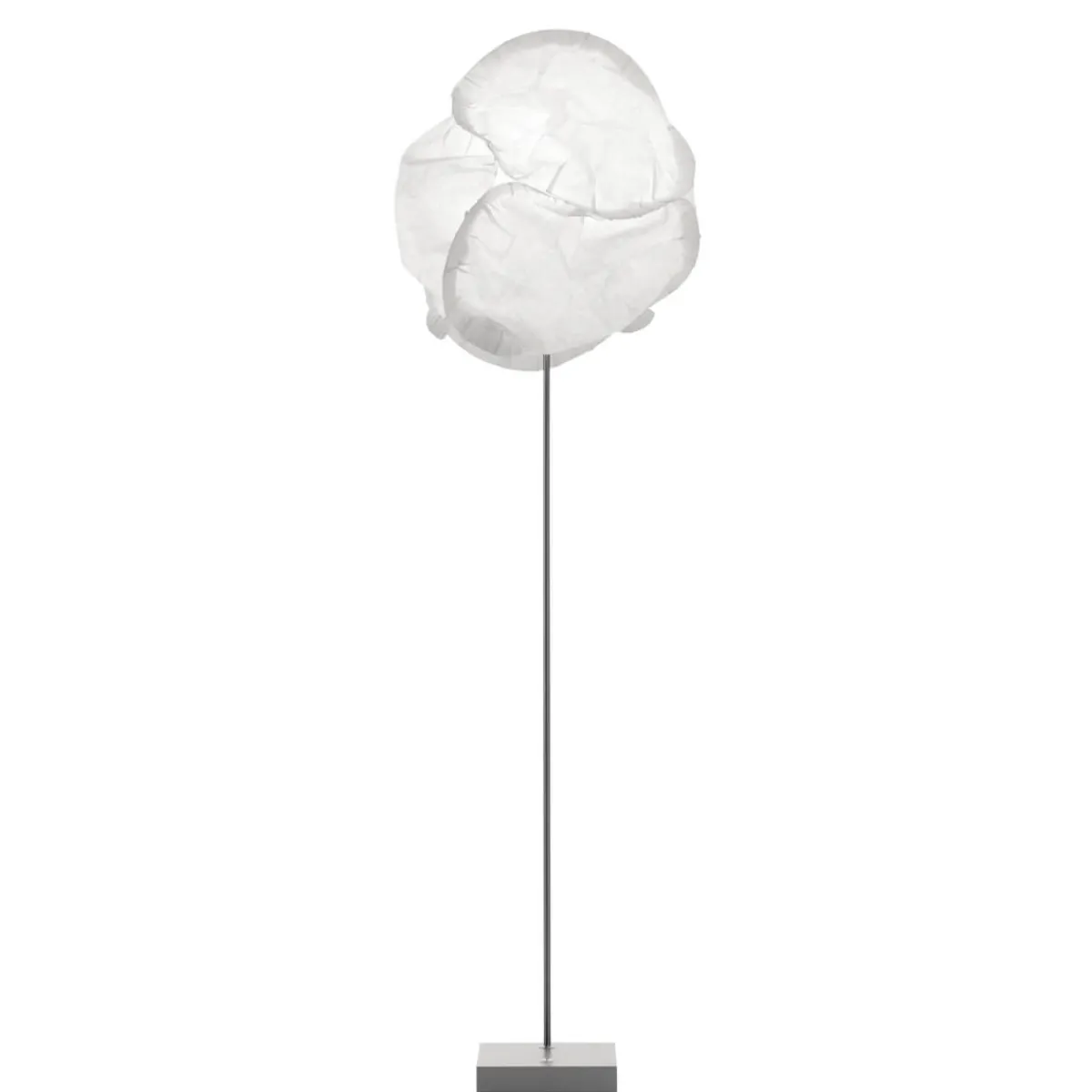 Gefertigt aus strapazierfähigen, leichten Materialien, überzeugt die Stehlampe durch ihre hochwertige Verarbeitung. Ihr voluminöser Schirm erinnert an einen weichen Schneeball und erhält durch Falten und Knicke eine organische Struktur. Jede ist ein Unikat, da der Schirm aus mehreren zusammengesteckten Schalenelementen besteht, deren Form sich individuell anpassen lässt. Durch sanftes Ausbeulen oder Eindrücken können Nutzer die Optik jederzeit verändern. Der schlanke Aluminiumfuß sorgt für Stabilität und fügt sich harmonisch in das Gesamtdesign ein.