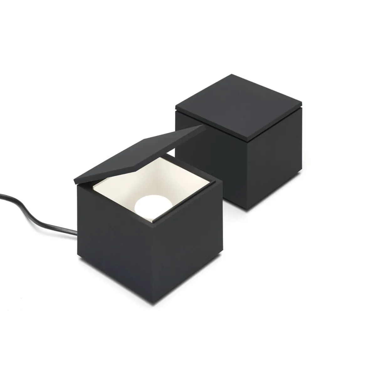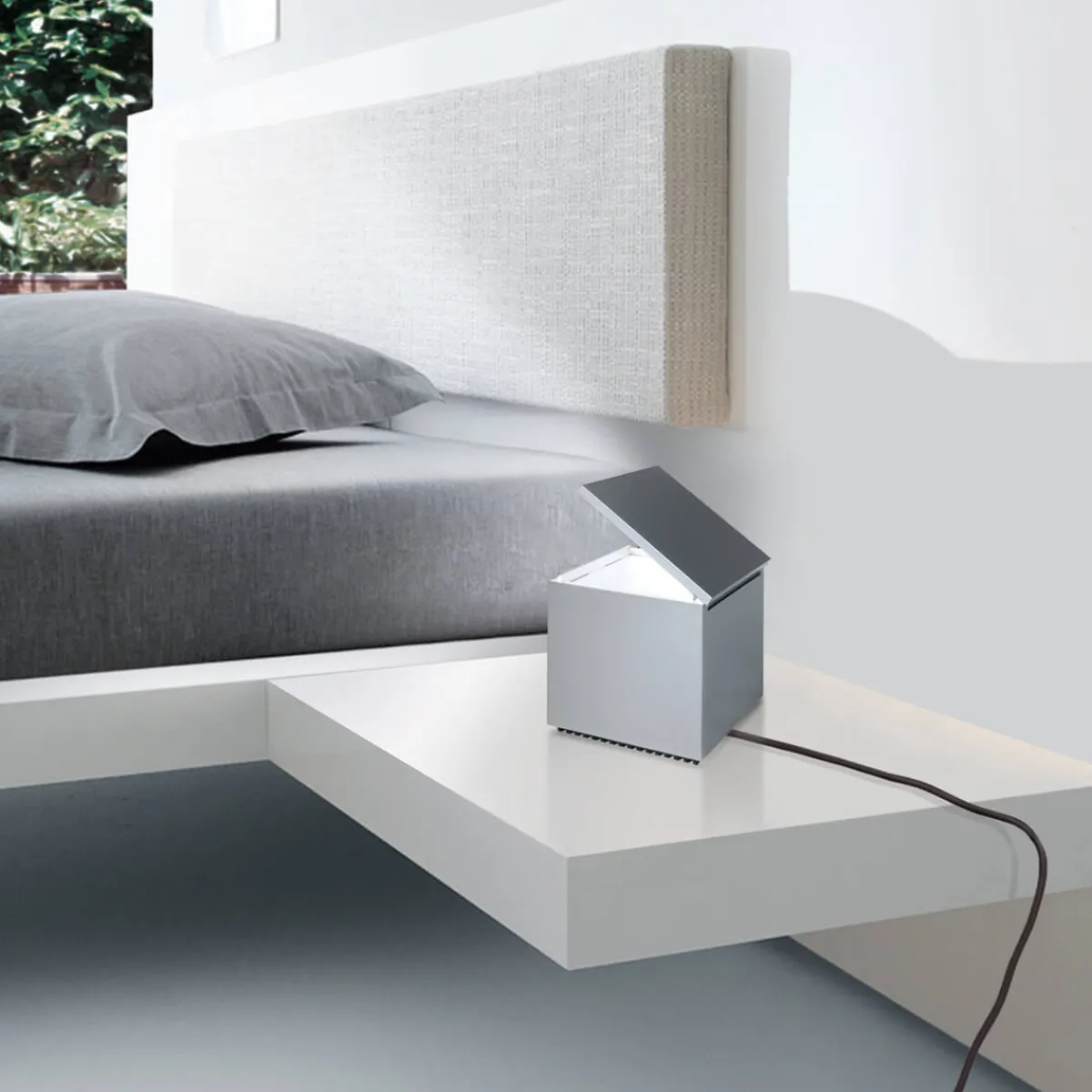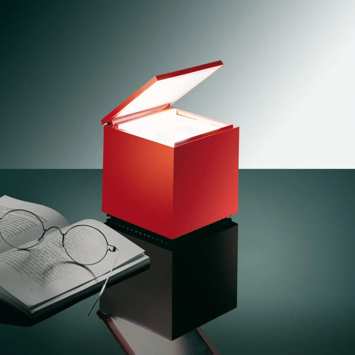Das Besondere an der kleinen Cini & Nils Cuboluce Tavolo ist die Technik zur Lichtregulierung: Das An- und Ausschalten der erfolgt mittels Auf- und Zuklappens des Reflektordeckels, was das lästige Suchen nach dem Lichtschalter, vor allem bei Nacht, gänzlich überflüssig macht.