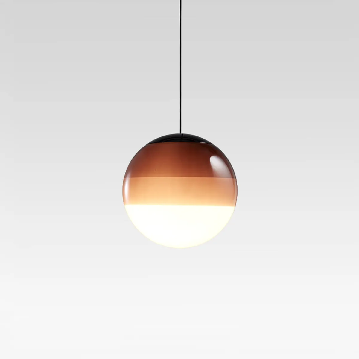 Trotz ihrer geringen Größe besitzt die Pendellampe alle charakteristischen Designelemente der Kollektion. Die mundgeblasene Glaskugel wird in einem präzisen Verfahren mehrfach in Farbe getaucht, wodurch ihr charakteristischer Farbverlauf mit sanften, konzentrischen Schichten entsteht. Diese Farbnuancen verleihen dem Licht eine besondere Tiefe und erzeugen eine stimmungsvolle, fast poetische Lichtwirkung.