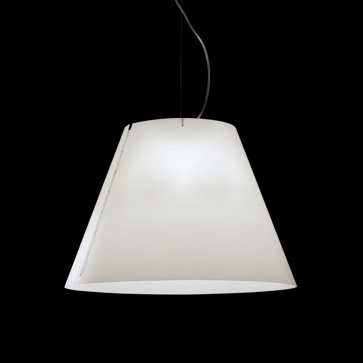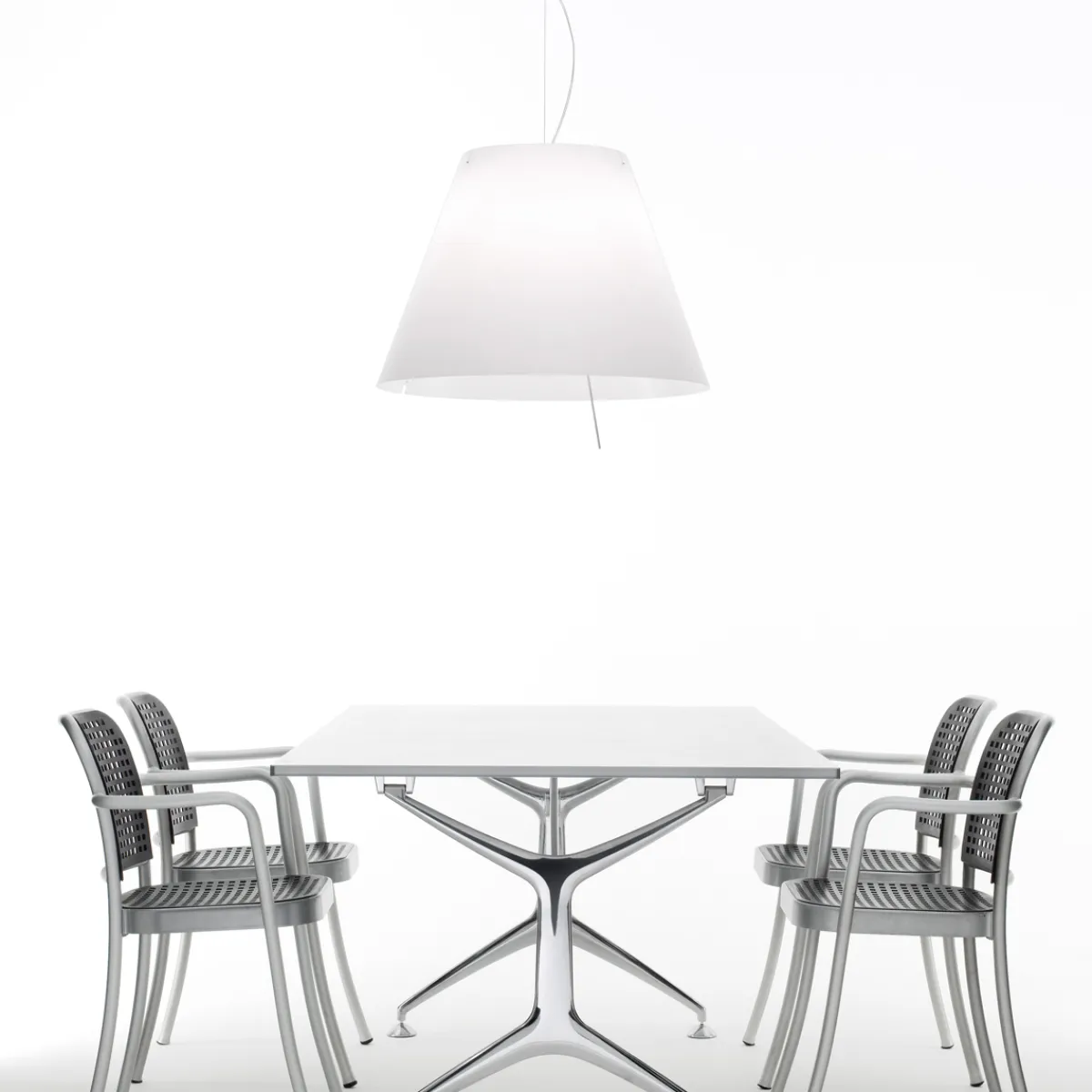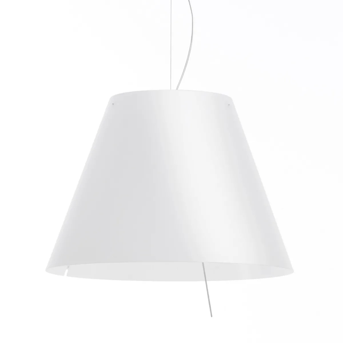 Obgleich von maximaler Dimension, wirkt die Luceplan Grande Costanza Sospensione ausgewogen und leicht. Hierzu trägt nicht nur die klare Formensprache bei, sondern auch das Material des Leuchtenschirms: Aus widerstandsfähigem Polycarbonat gefertigt, ist er von nur geringem Gewicht.