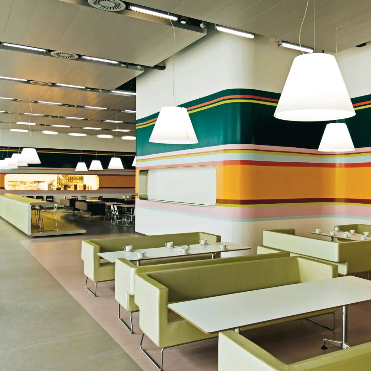 Hierdurch eignet sich die Grande Costanza Sospensione vor allem für großflächige Raumbereiche, etwa in Restaurants, Wartesälen oder einem größeren Wohnzimmer, wo sie ein behagliches, einhüllendes und diffus gestreutes Licht erzeugt.