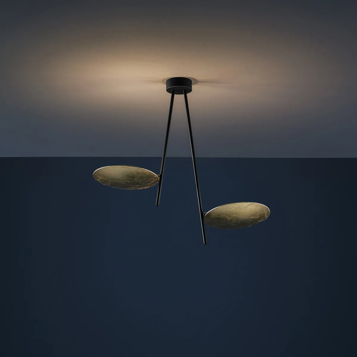 Die Catellani & Smith Lederam C2 Deckenleuchte ist in zahlreichen farblich aufeinander abgestimmten Oberflächenkombinationen zu erwerben. Die aus Aluminium gefertigten Reflektorscheiben sind weiß, schwarz lackiert oder mit Blattgold bzw. Blattkupfer belegt. Verknüpft werden sie mit schmalen Stangen aus satiniertem, vergoldetem oder schwarz lackiertem Metall. Der Baldachin ist weiß (Ausführung Scheiben weiß) oder schwarz (Ausführung Scheiben schwarz / Gold / Kupfer).