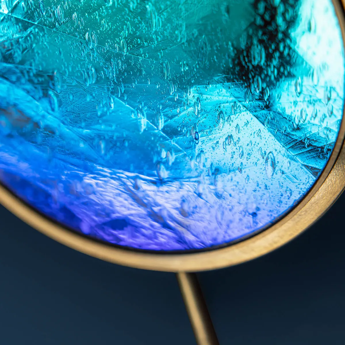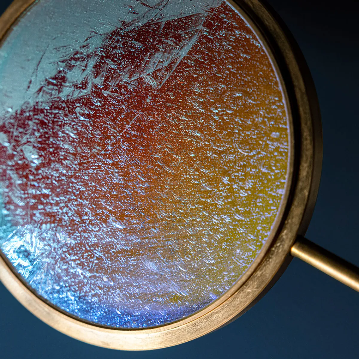 | Material/Oberfläche: | Unbehandeltes Messing, handgefertigtes schillerndes Glas |